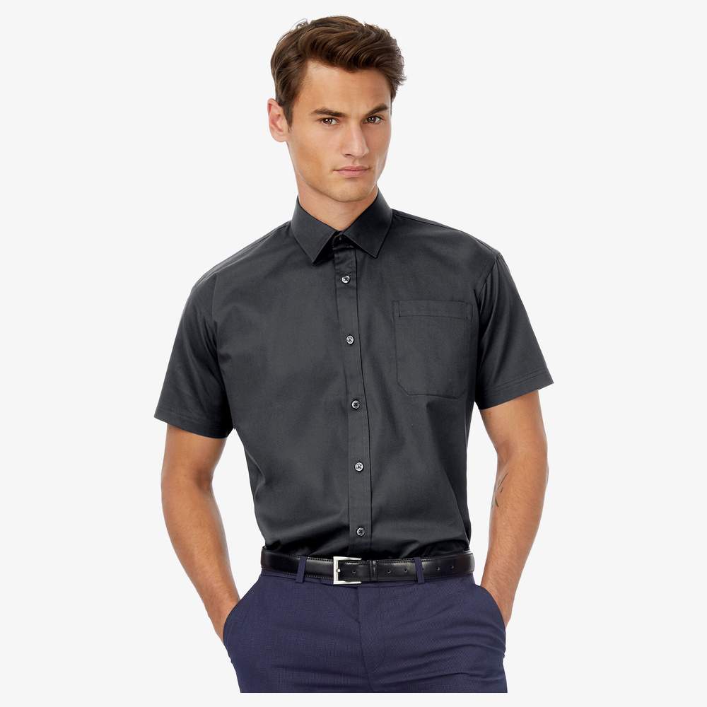 Short-sleeved shirt in pure serge cotton treated Easy Care with peach skin finish for a soft touch. Applied chest pocket. Cross-stitched mother-of-pearl buttons. Horizontal last buttonhole. Back yoke with pleats on each side and stitching. Rounded hem with square reinforcements on the sides. 2 spare buttons. Tie fix. Reinforced contemporary collar with non-removable stiffeners.