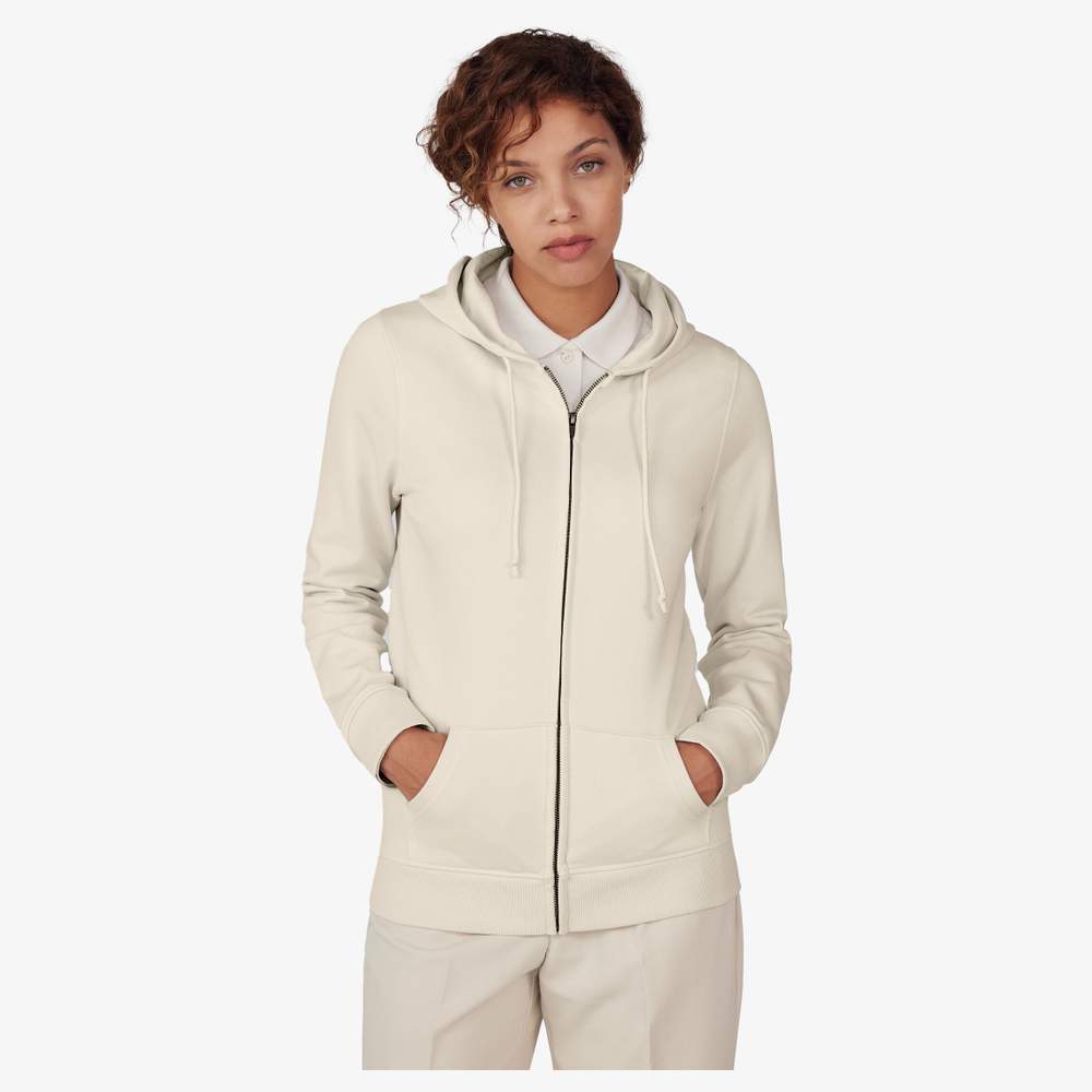 Women's zippered hoodie, designed with a blend of organic or conversion cotton and recycled polyester. Feminine cut with side seams for a fitted silhouette. The French Terry interior offers optimal comfort. Presence of a discreet "Hi! I'm Organic" label in the collar and absence of a visible brand label. Covered metallic zip closure and lined hood with drawstrings. Durable and soft to the touch fabric.