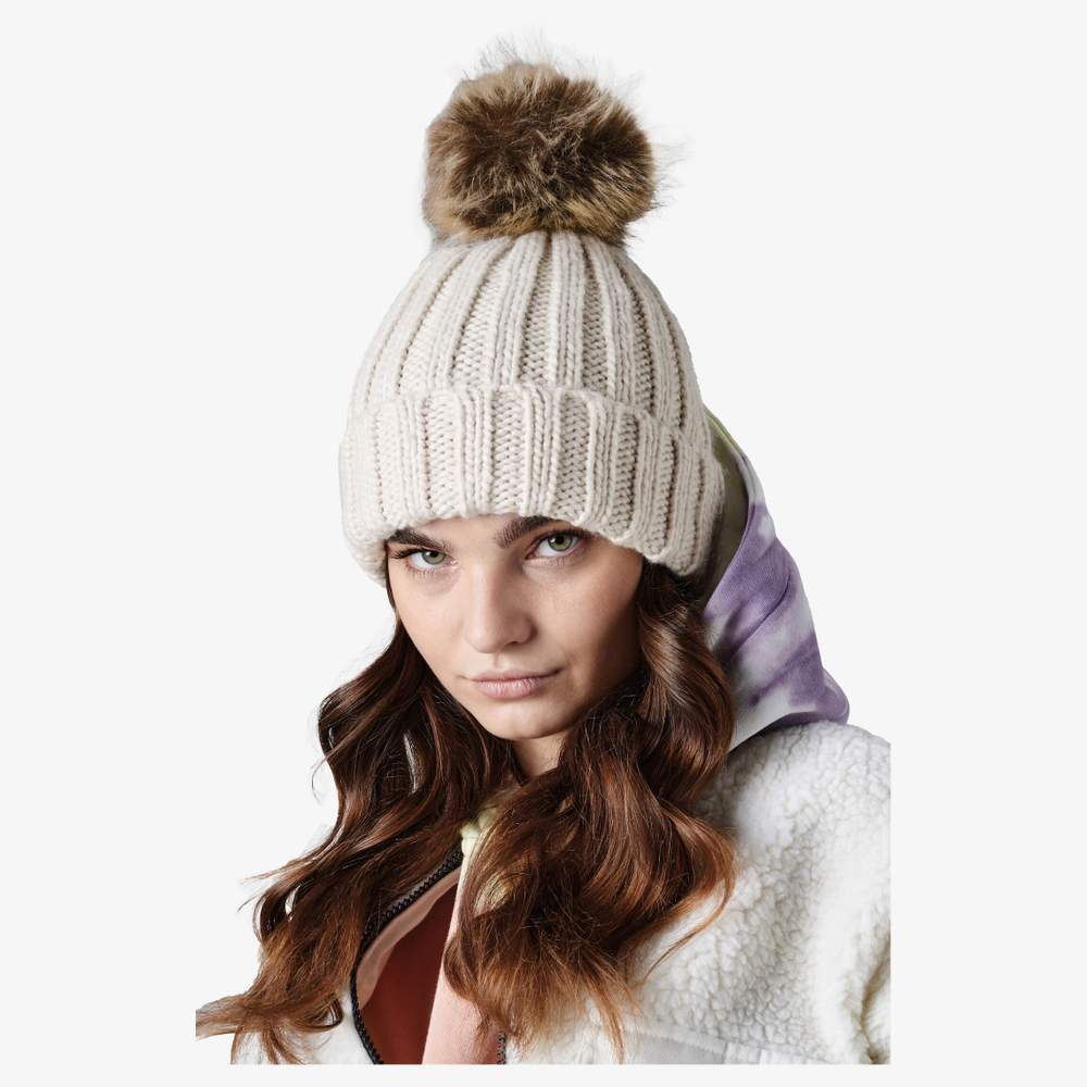 This hat features a wide-knit ribbed and reversible design for versatile use. It is equipped with a removable pompom made of faux fur, making it easy to maintain. Its unisex design makes it suitable for different profiles. The one size ensures a comfortable fit. The detachable label allows for easy customization.