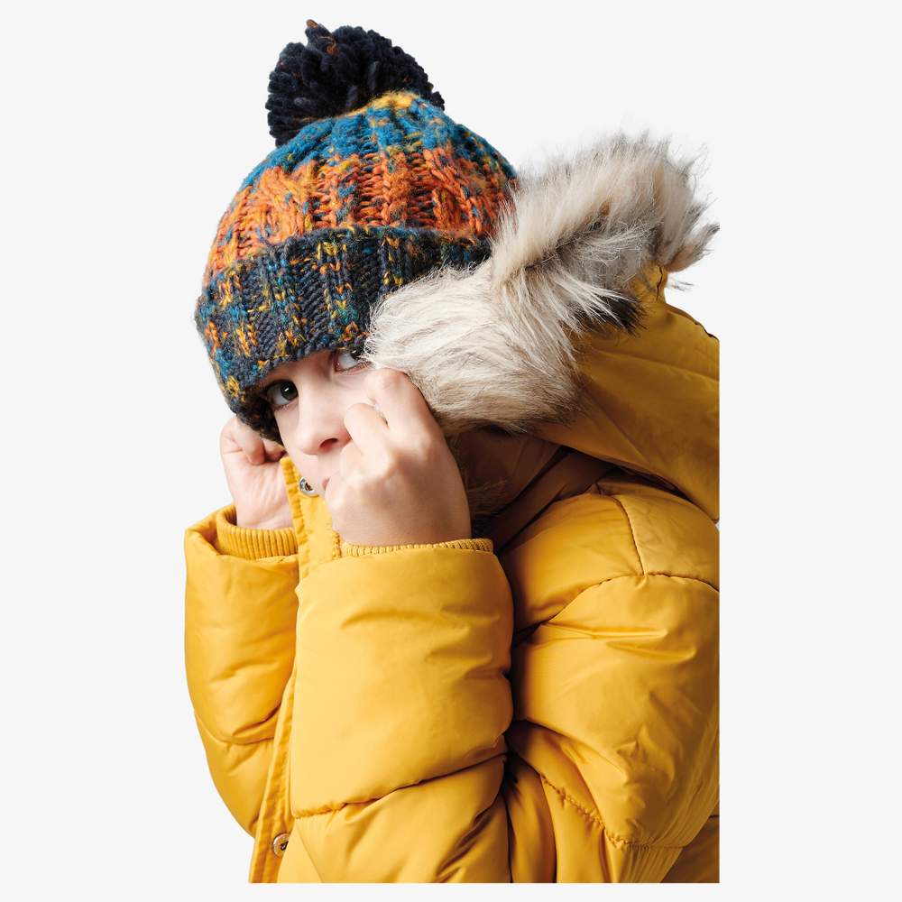 Child's thick twisted multi-thread knit beanie. Four-color design. Imitation sheepskin thermal strip for added warmth. Reversible design for optimal decoration. One size fits all. Detachable label. Composition: 100% lightly spun acrylic.