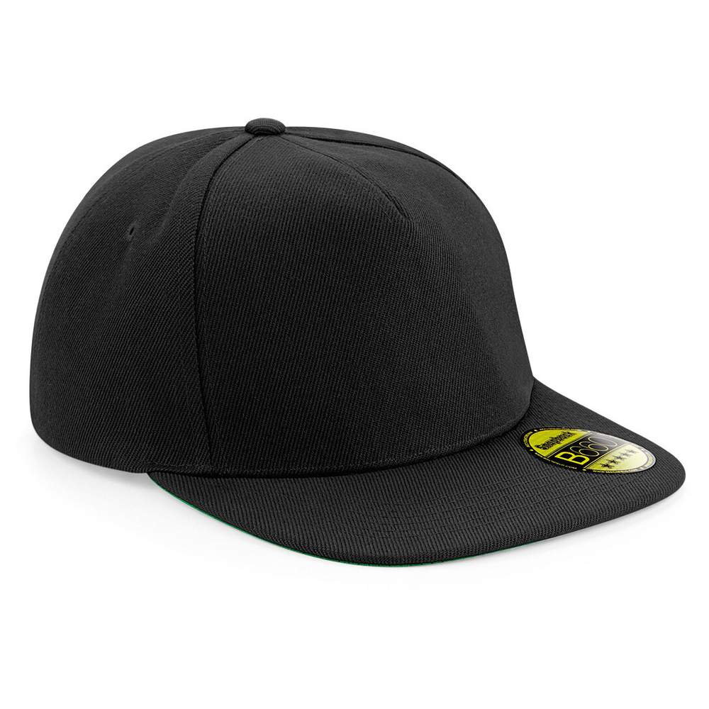 This five-panel Beechfield cap offers a modern style with its flat visor and embroidered ventilation holes. The under-visor is green, except for the Black/Black/Black model which has a black under-visor. It is adjustable thanks to a plastic closure. Made of 100% serge polyester, it is both resistant and comfortable. Customization possible with embroidery for a unique and professional finish.