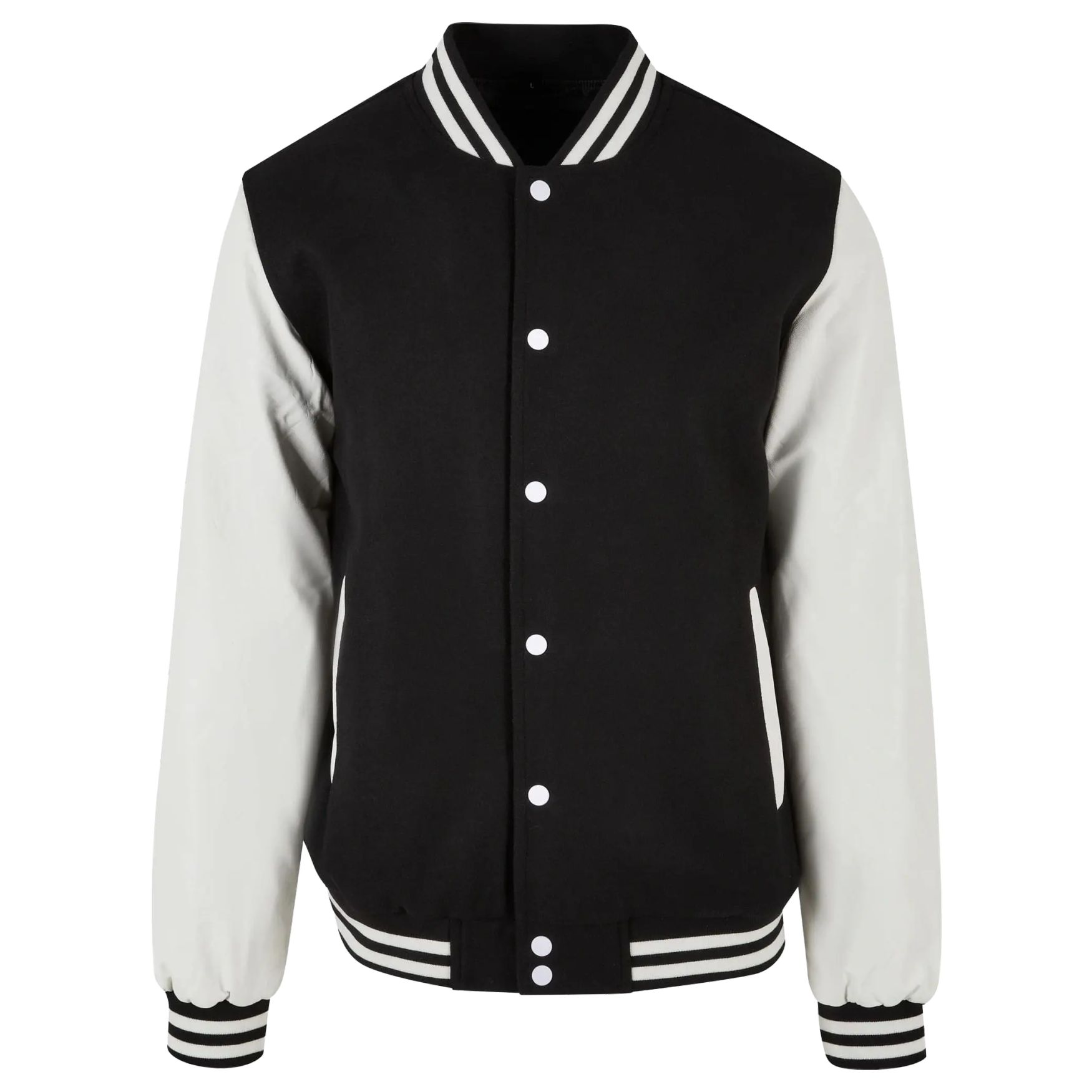 The Oldschool College Jacket baseball jacket in faux leather with faux leather sleeves and a brushed interior. Side pockets, ribbing at the collar, cuffs and hem, snap button closure. Composition: 50% wool, 50% viscose.