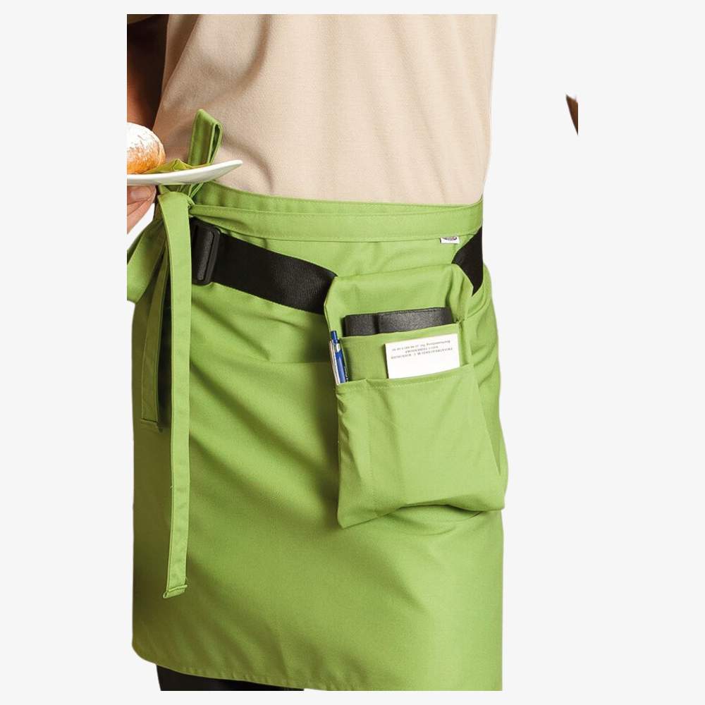 Pouch designed to attach to apron straps or belts. This accessory offers a practical solution for carrying personal or professional items. Its wrinkle-resistant design facilitates maintenance and ensures a neat appearance. Made in Germany, this item is designed for durable use. Dimensions: 15x23cm. Composition: 65% Polyester / 35% Cotton.