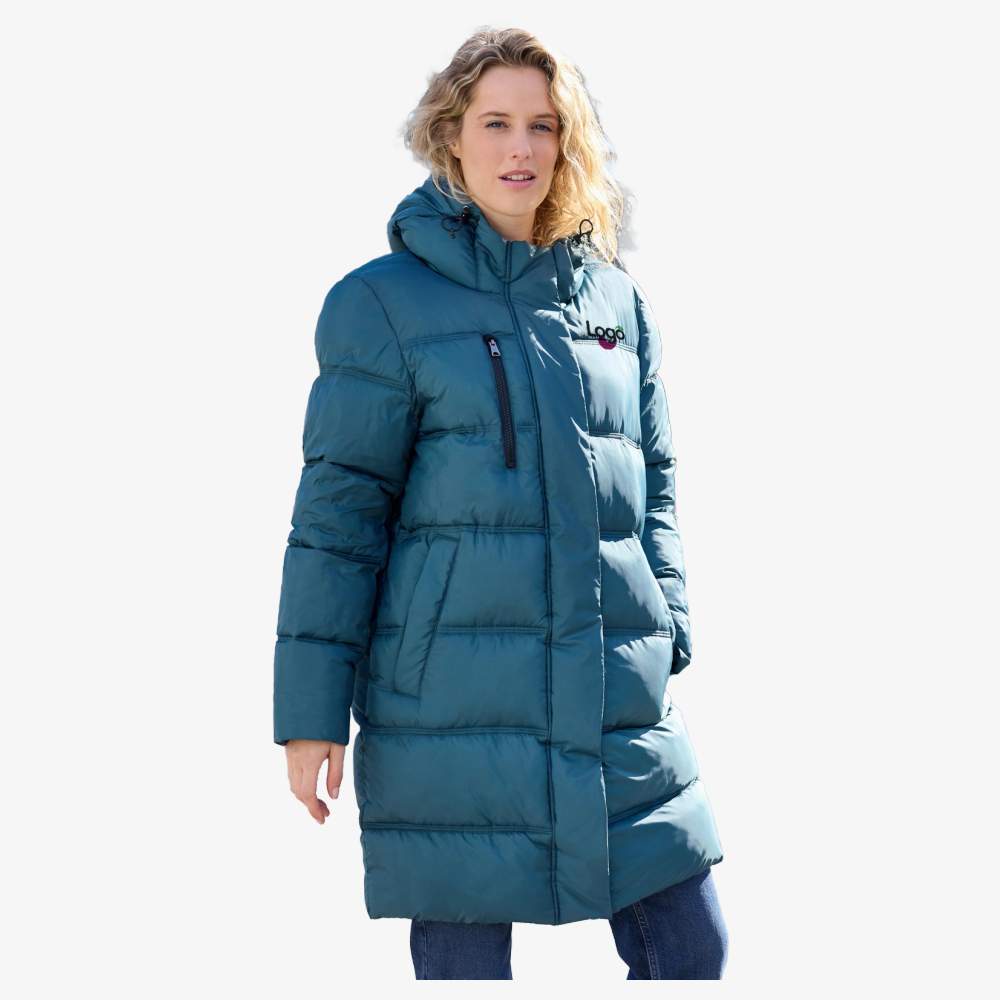 Padded winter coat in recycled polyester. Sugenro filling divided into large compartments. Chest pocket with zip closure. 2 side pockets with zip closure. Bidirectional zipper along the entire length. Two large internal pockets. Adjustable hood. Triple stitching. Elastic internal cuffs. Composition: 100% polyester. This coat offers the possibility to customize your garment with embroidery, adding a unique touch to your style or your company's image.