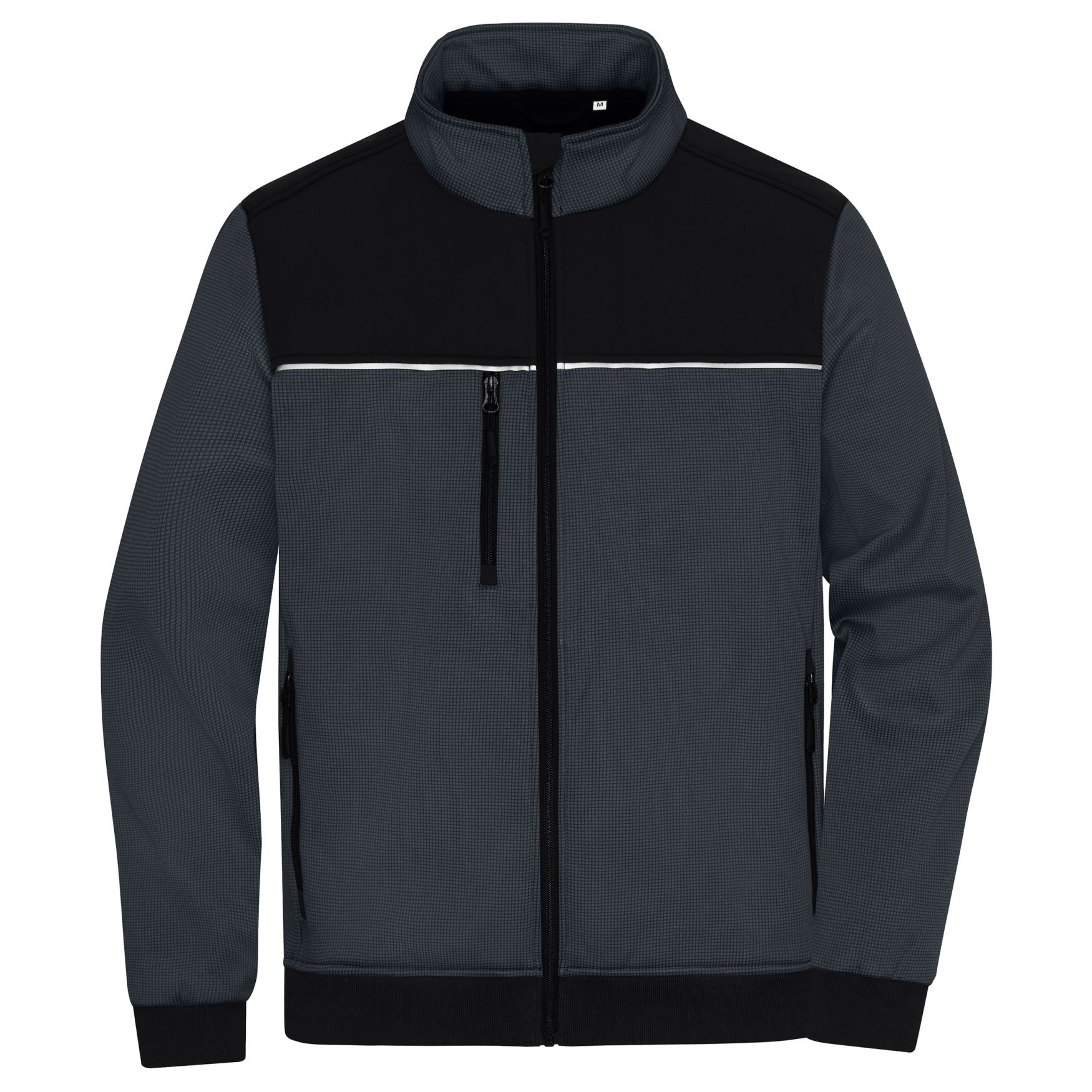 Hybrid workwear jacket made from a 2-layer Softshell fabric with Sherpa interior. It features single-color inserts on the front and back, facilitating printing and embroidery for optimal customization. This model is designed to resist water and dirt thanks to its BIONIC-FINISH® ECO finish. It features an invisible full-length zipper, a stand-up collar with chin guard, elastic bands at the hem and cuffs, as well as side pockets, a zipped chest pocket and two interior pockets. It integrates reflective elements at the front and back (no protective function/no PPE) as well as YKK zips. Its composition is as follows: exterior fabric 96% polyester, second exterior fabric 88% polyamide, 12% elastane and padding 100% polyester.