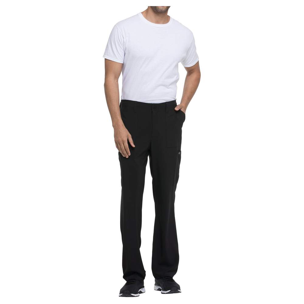 Men's work pants, masculine cut. Elastic waistband at the back with interior drawstring. Zippered fly with button closure. Five belt loops. Six pockets: two front patch pockets, two cargo pockets, two back pockets. Utility serge strip with instrument loop.