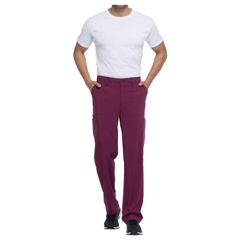 Men's work pants, masculine cut. Elastic waistband at the back with interior drawstring. Zippered fly with button closure. Five belt loops. Six pockets: two front patch pockets, two cargo pockets, two back pockets. Utility serge strip with instrument loop.