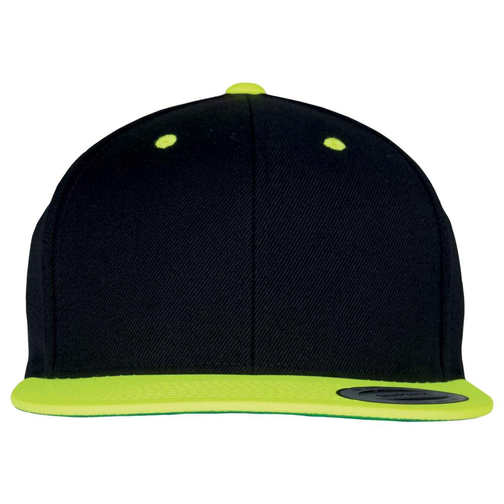 The classic shape of the Snapback Cap in a bicolor version to perfectly match each of your outfits. Adjustable snap closure for a perfect fit. Classic shape in bicolor version. First-quality wool blend. Contrasting eyelet and button. Durable bougran. Green underside of visor. Composition: 80% acrylic, 20% wool. Possibility to customize this cap with embroidery for a unique and professional result.