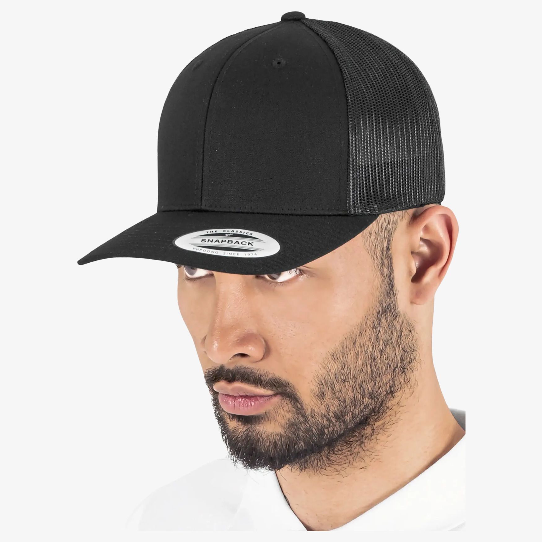 Retro trucker cap with 6 panels and curved brim. This cap features a matching underside of the brim, a trucker mesh at the back and an adjustable plastic snapback closure. Available in a wide range of colors, it is made from blended cotton.