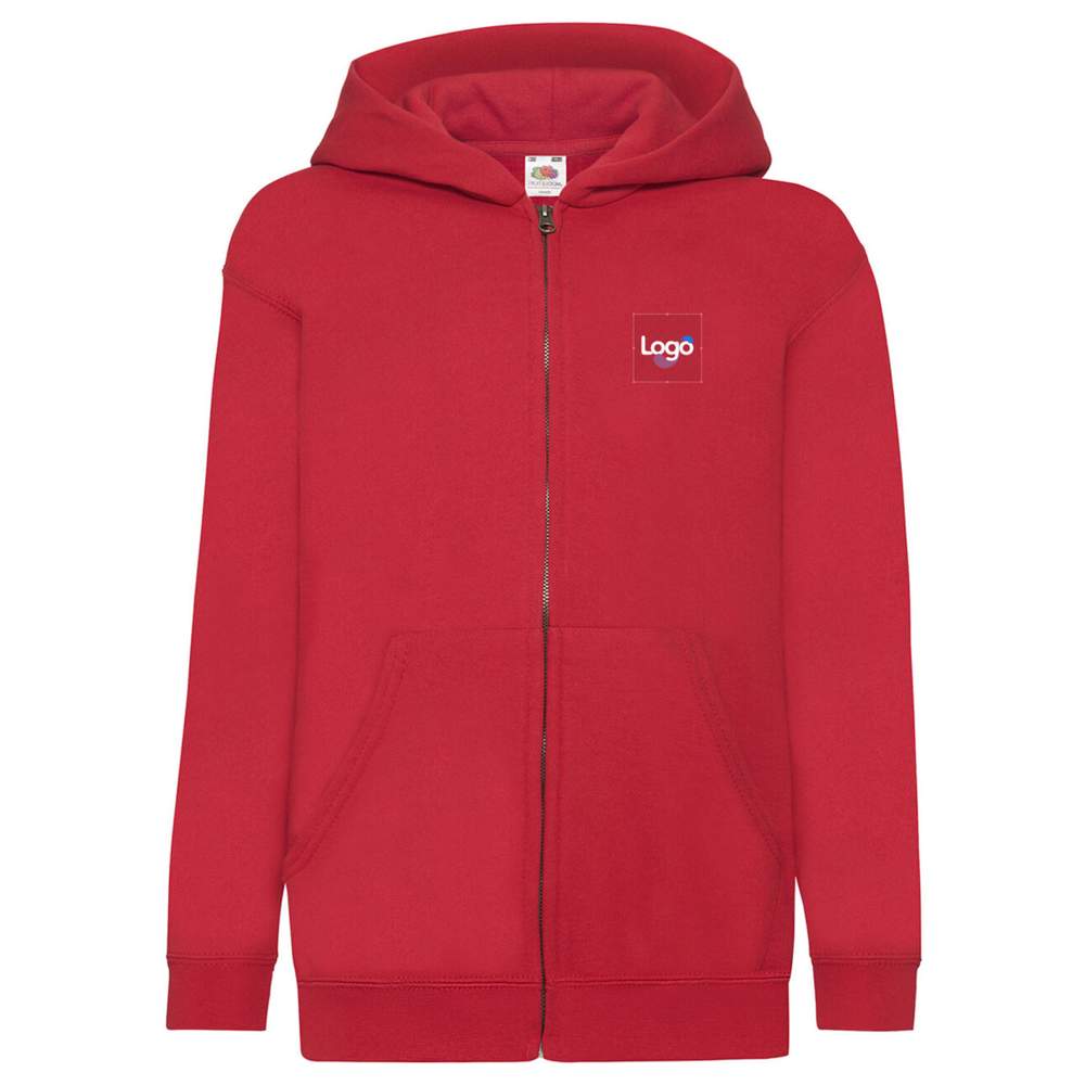 Classic children's Fruit of the Loom hooded sweatshirt, made of cotton/polyester. This sweatshirt offers optimal comfort thanks to its simple jersey band. Its covered zipper facilitates printing and customization. The unlined hood without a cord meets safety standards for children's clothing. It has 2 front pockets and ribbed waistband and cuffs in cotton/Lycra® for an adjustable fit. This sweatshirt is customizable by embroidery or by printing your logo.