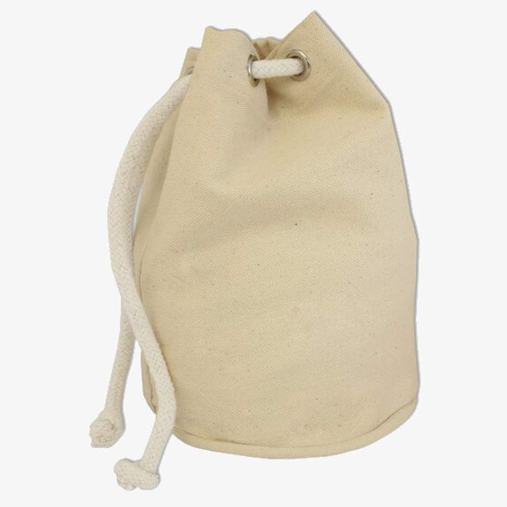 Robust cotton canvas bag designed for daily use. It stands out for its solid construction and careful finishes. Equipped with metal eyelets reinforcing durability and a drawstring closure ensuring the security of the contents. Its round shape and compact dimensions offer a balance between capacity and practicality. This bag is suitable for various activities, such as carrying personal items.