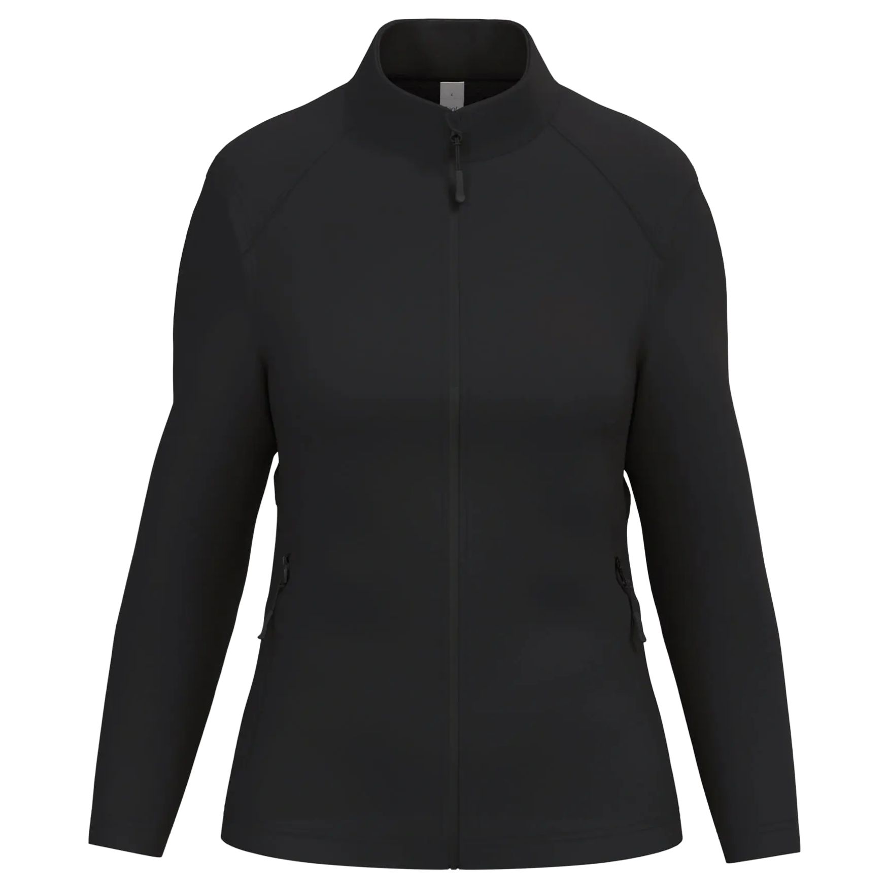 The women's 2-layer softshell jacket combines a water-repellent treatment with a black 100% polyester micropolar lining. It features a straight cut with a stand-up collar and two side pockets lined with polytricot equipped with nylon zips. The nylon zip closure includes a chin guard and the back has shoulder inserts with topstitching. The hems and sleeves are finished with double stitching. Main composition is 95% polyester and 5% elastane.