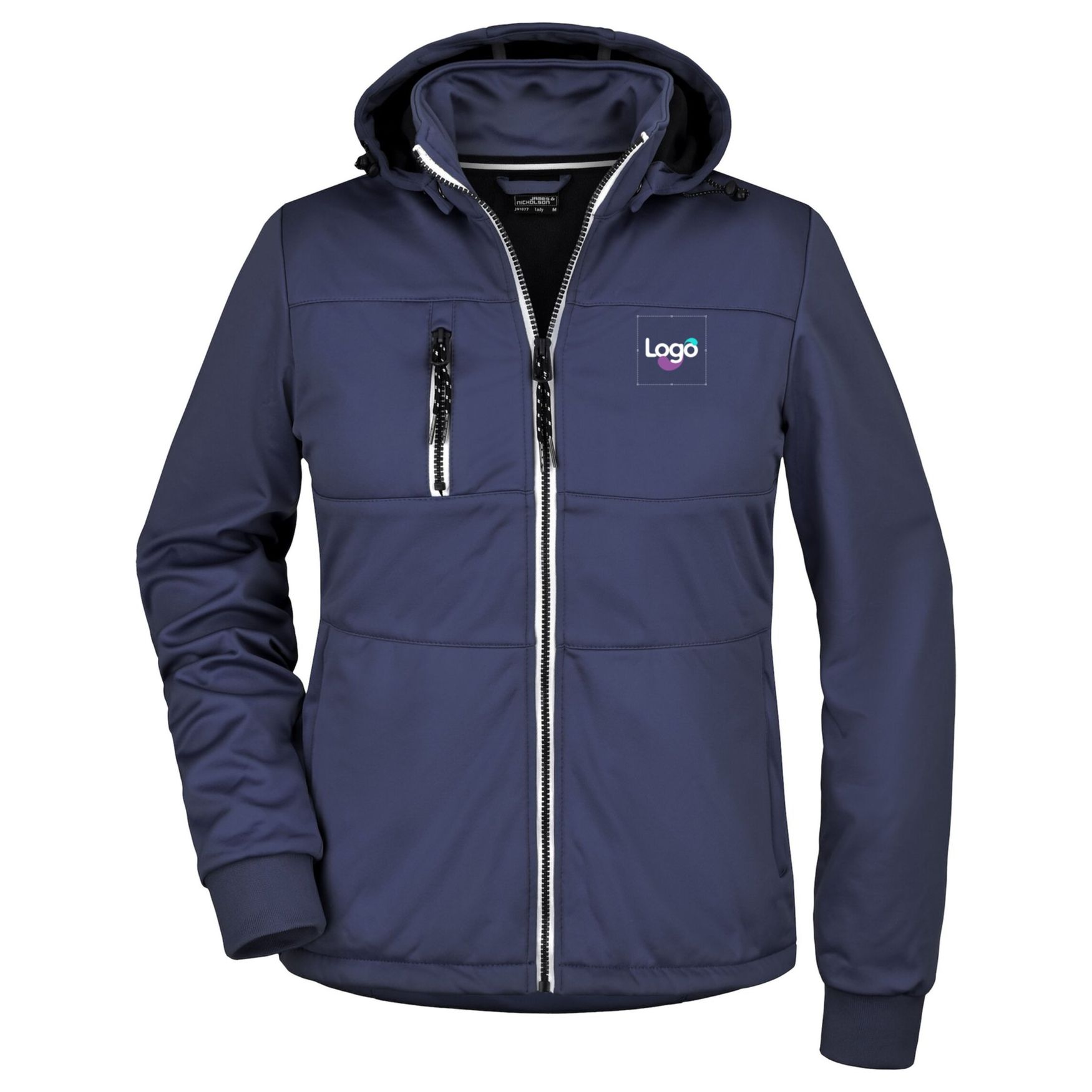 Womens softshell jacket made of polyester. It offers protection against wind and moisture thanks to its TPU membrane. Its fitted cut and modern details make it both functional and aesthetic. It features a high collar, a detachable hood, two zipped side pockets, a zipped chest pocket, as well as an elastic cord with stop at the hood and hem. This jacket is also customizable, allowing the addition of your logo or graphic elements.