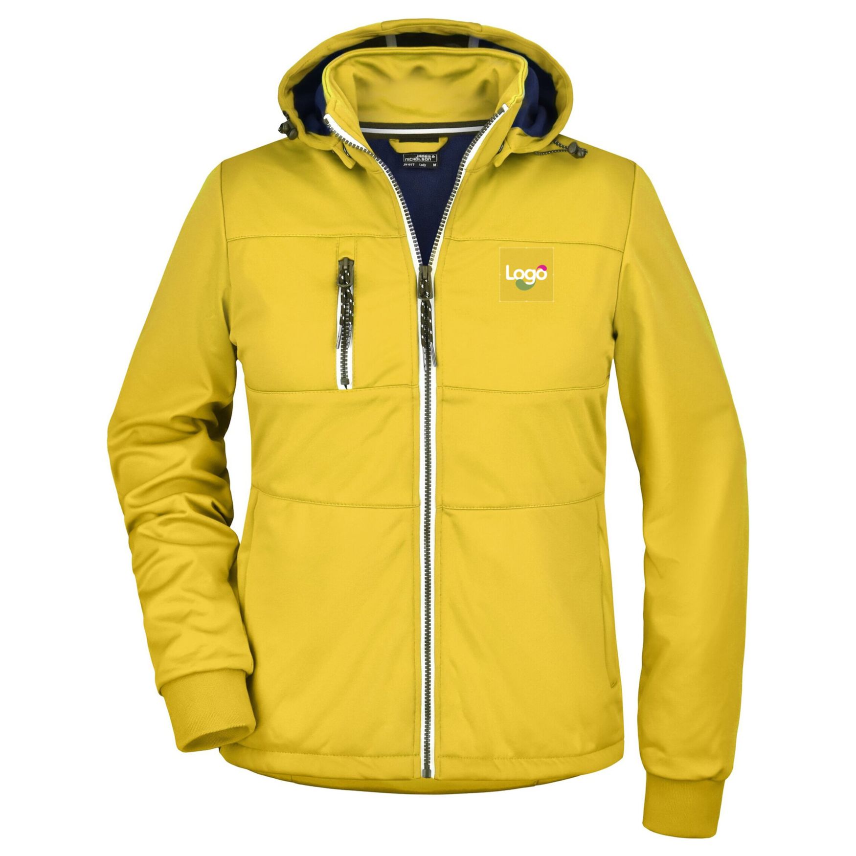 Womens softshell jacket made of polyester. It offers protection against wind and moisture thanks to its TPU membrane. Its fitted cut and modern details make it both functional and aesthetic. It features a high collar, a detachable hood, two zipped side pockets, a zipped chest pocket, as well as an elastic cord with stop at the hood and hem. This jacket is also customizable, allowing the addition of your logo or graphic elements.