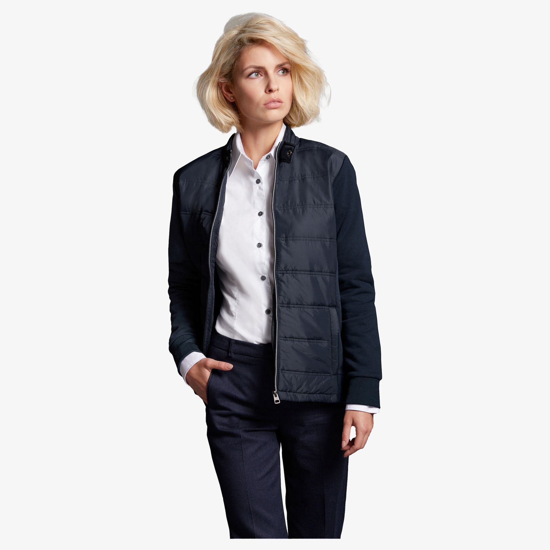 Women's sweatshirt jacket, fitted cut, trendy in a mix of materials. The back and sleeves are made of high-quality French Terry fabric. Not brushed on the inside, slightly padded and quilted in the front. Features two side pockets with zip closures and two inner pockets. Outer fabric composition: 80% cotton, 20% polyester; outer fabric 2: 100% polyamide; padding: 100% polyester. This jacket is ideal for customization with embroidery.