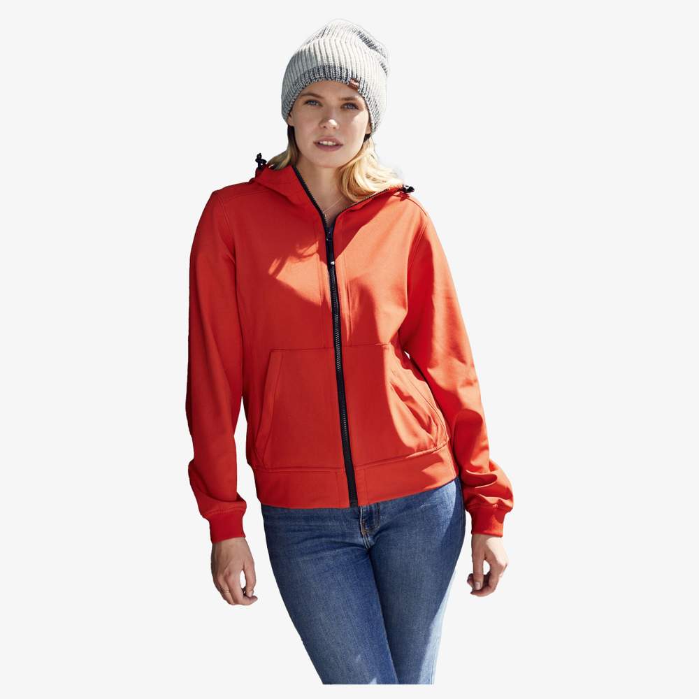 Women's softshell jacket, slightly fitted, with 2 layers and contrast interior look mesh, water-resistant and dirt-resistant thanks to the BIONIC-FINISH®ECO finish. It has elasticated wrists and waist, a zipped kangaroo pocket and 1 interior pocket as well as an adjustable fixed hood. This jacket is customizable with embroidery for adding your logo or design. Composition: 94% polyester, 6% elastane.