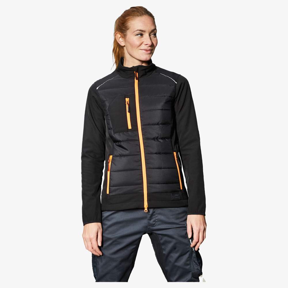 Softshell jacket for women, slightly fitted, in a double-layer blend of easy-care materials, with quilted panels at the front and back, water and dirt resistant thanks to the bionic-finish®eco finish. Warm DuPont™ Sorona® padding, high collar and full-length double-sided zipper with wind protection and chin protection. Adjustable width at the hem. Side pockets and chest pocket with zipper, inner pocket with hook-and-loop closure. Reflective elements (non-protective / non-PPE) at the front and back. Zipper for decoration on the back. Composition: 100% polyester including recycled polyester. This jacket is ideal for customization with embroidery, allowing you to add your logo or graphic elements.