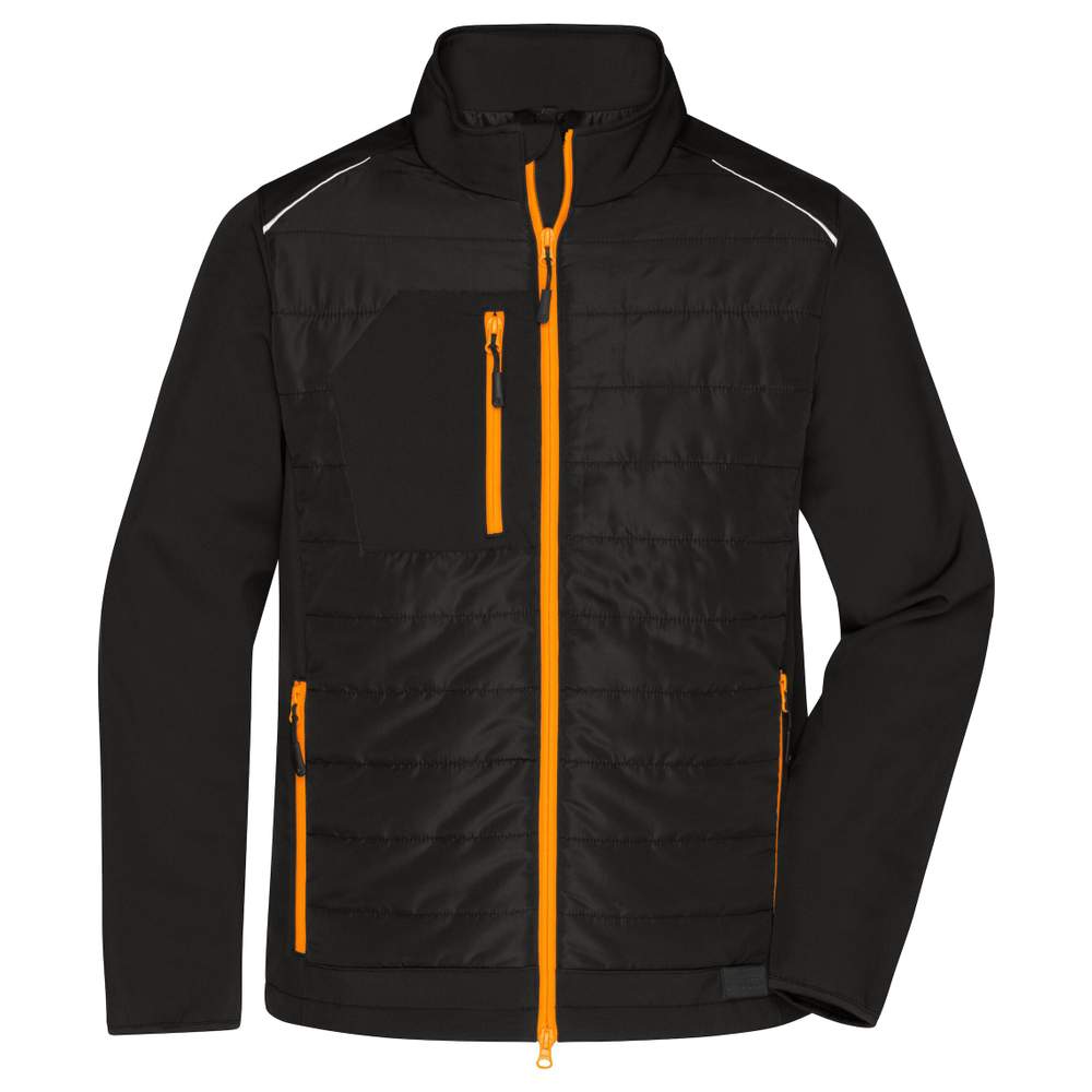 Softshell jacket in an easy-to-maintain double-layer material mix, with quilted panels on the front and back, water and dirt resistant thanks to bionic-finish eco. Warm DuPont Sorona filling, high collar and full-length two-way zipper with wind protection and chin guard. Adjustable hem width. Side pockets and chest pocket with zipper, interior pocket with hook-and-loop closure. Reflective elements on the front and back. Zipper for decoration on the back. Customization possibility with embroidery for increased brand visibility. Composition: 100% polyester including recycled polyester. Finish: bionic-finish eco. Filling: DuPont Sorona. Features: Water-resistant, windproof, reflective elements