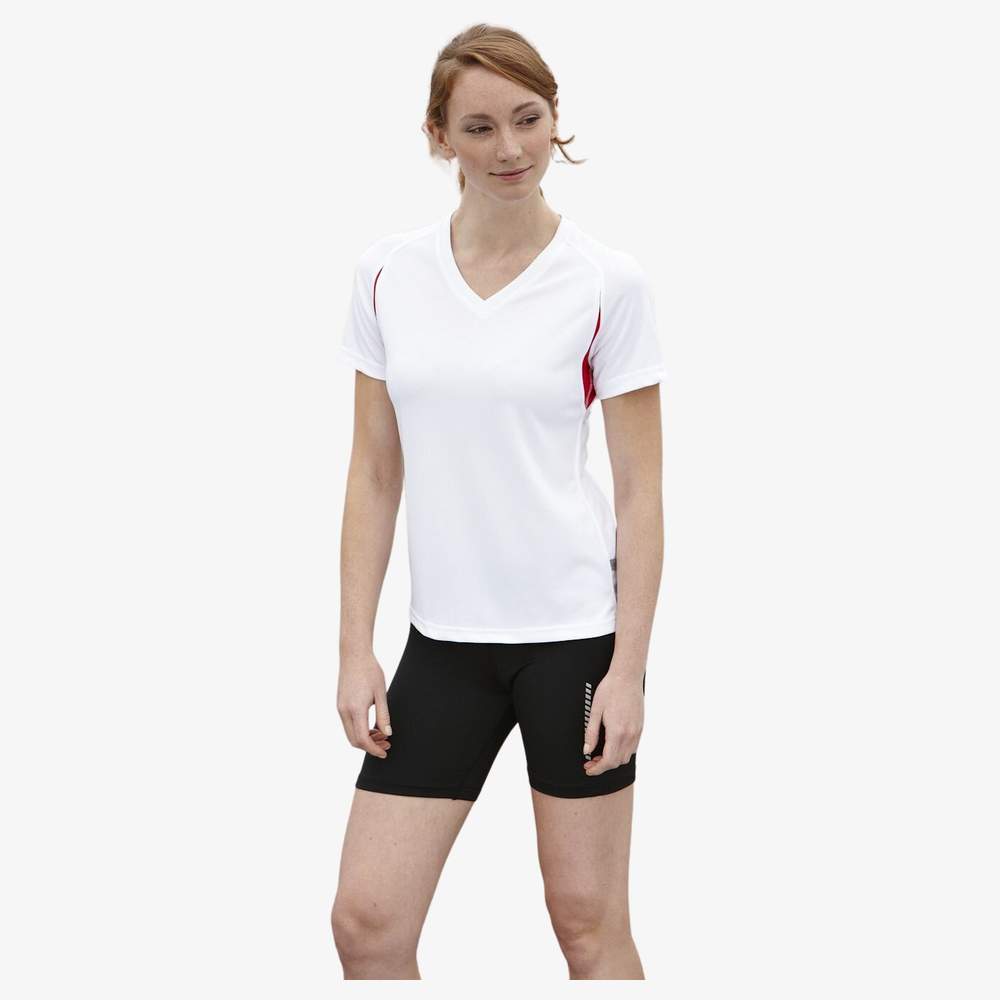 This breathable V-neck running T-shirt for women is designed for optimal comfort during running. Made from a 100% polyester fabric that ensures breathability and quick drying for effective moisture regulation. Its fitted cut offers freedom of movement while hugging the body. Contrast mesh inserts add an aesthetic touch and improve ventilation. A reflective element on the back of the T-shirt enhances visibility and runner safety. Tissu extérieur: 100% polyester, Coupe: Fitted, Col: V, Détails: Contrast mesh inserts, Sécurité: Reflective element on the back