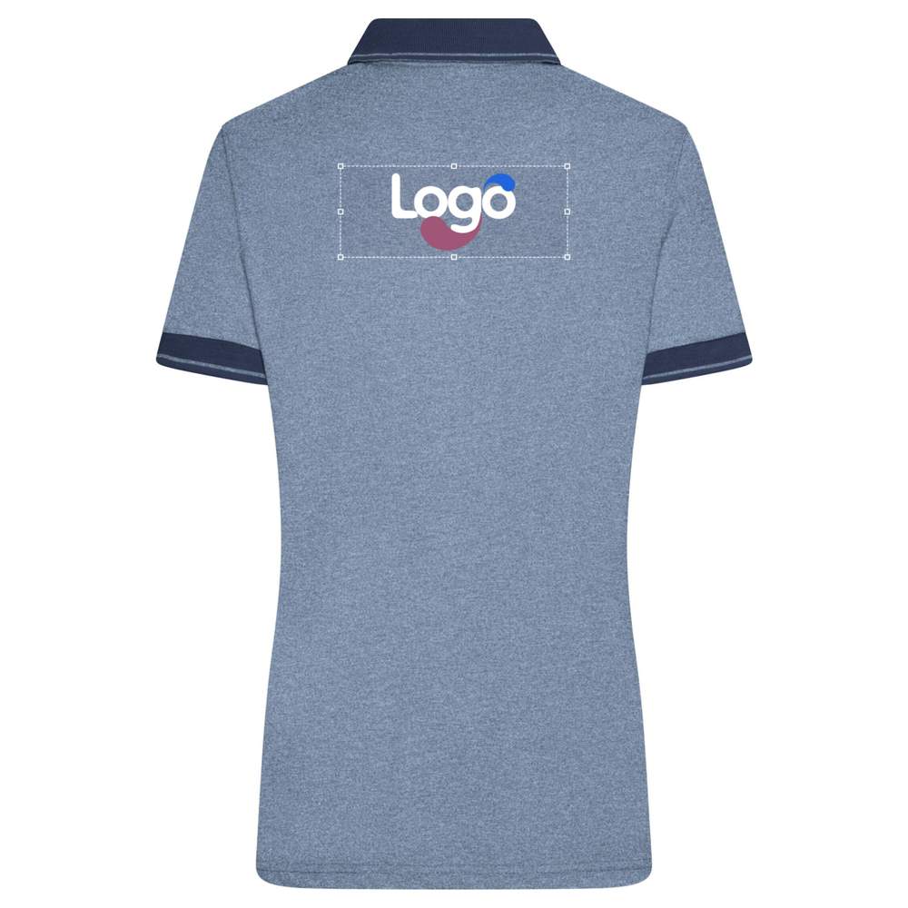 Women's polo, slightly fitted, in a trendy blend of materials, in fine simple jersey. Casual cut. Polo collar and cuffs with contrasting stripes. Has five buttons. Composition: 65% polyester, 35% cotton. This polo is ideal for customization by embroidery, allowing the addition of your logo or your graphic elements.