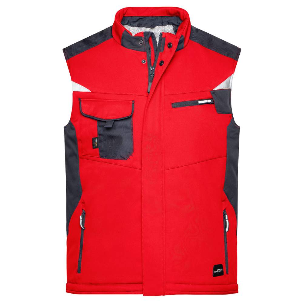 Professional sleeveless softshell vest for men with a warm lining. Made of robust and durable softshell material, windproof and water-repellent (water column of 2000 mm), with breathable and moisture-permeable properties. Features a high collar with soft fleece interior, reinforced shoulder area with CORDURA®. Full-length covered zipper with wind protection. Numerous pockets: side pockets, chest pocket and inner pocket with zipper, chest pocket with flap, inner pocket for mobile phone. Reflective elements (without protective function/non-PPE) on the front and back. Zipper for decoration on the back. This vest can be customized with embroidery to display your logo or visual.
