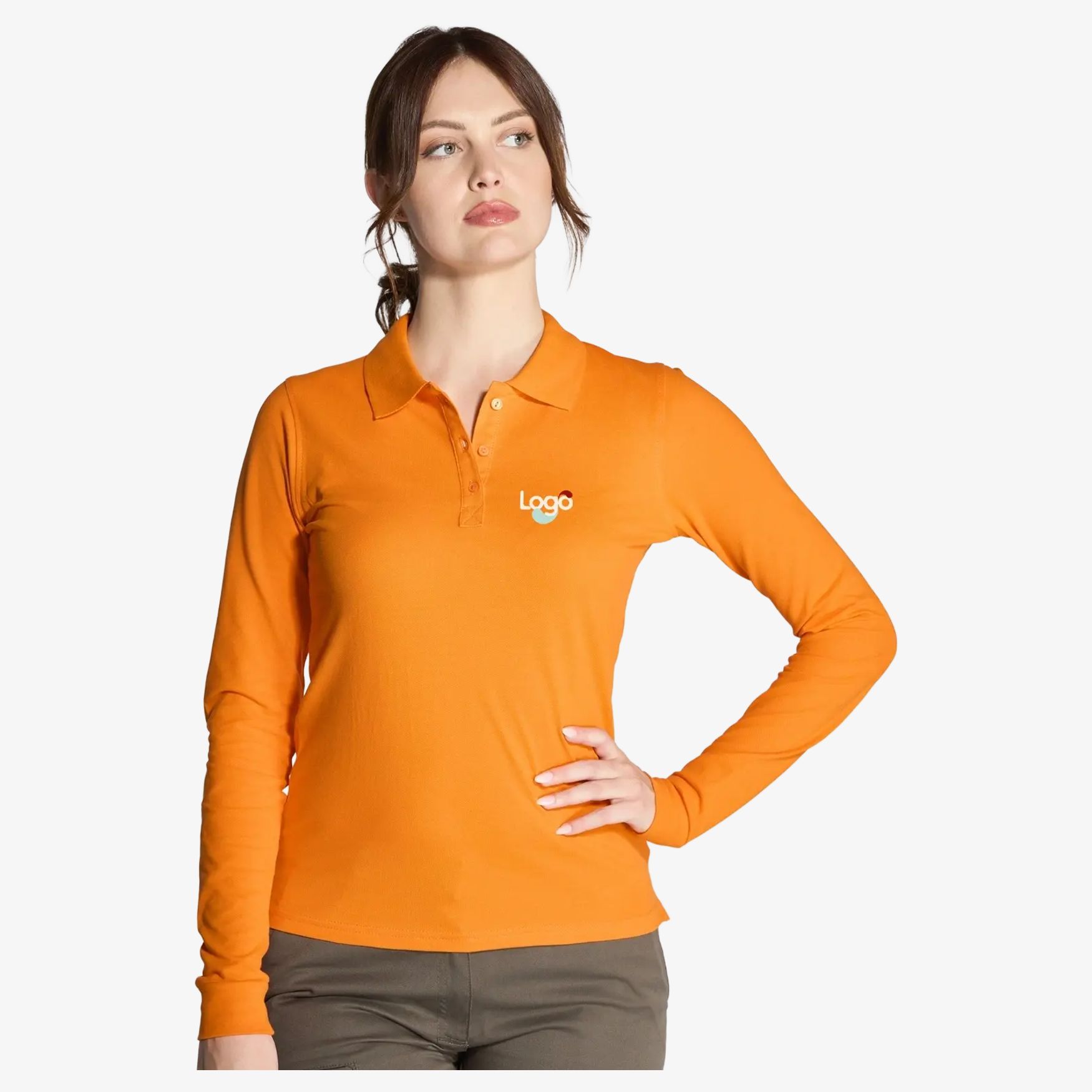 Women's long-sleeved polo, made of 100% combed cotton interlock knit for optimal comfort. It features a placket with 3 tone-on-tone buttons and side slits for greater freedom of movement. Its fitted cut offers a flattering silhouette. This polo is ideal for customization with embroidery, allowing you to add your logo or visual for effective communication. It is possible to customize this polo according to your wishes.