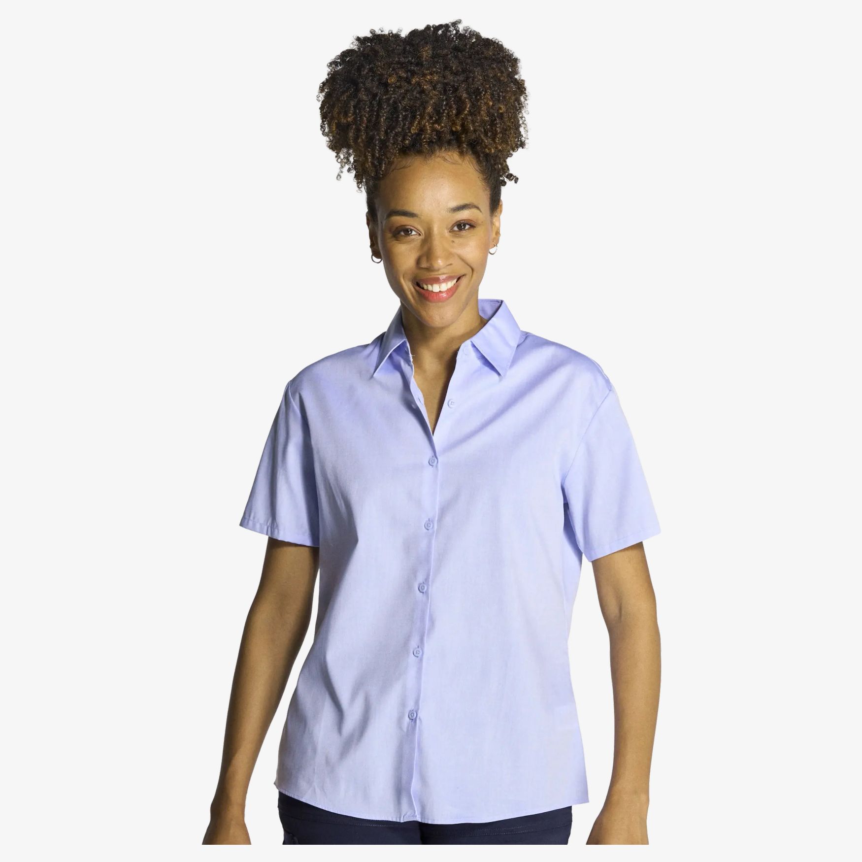 This women's Oxford shirt features a fitted cut and short sleeves. It is made of cotton and polyester for lasting comfort. The tone-on-tone buttons add a subtle touch. Suitable for various occasions, this shirt offers a good balance between comfort and elegance.