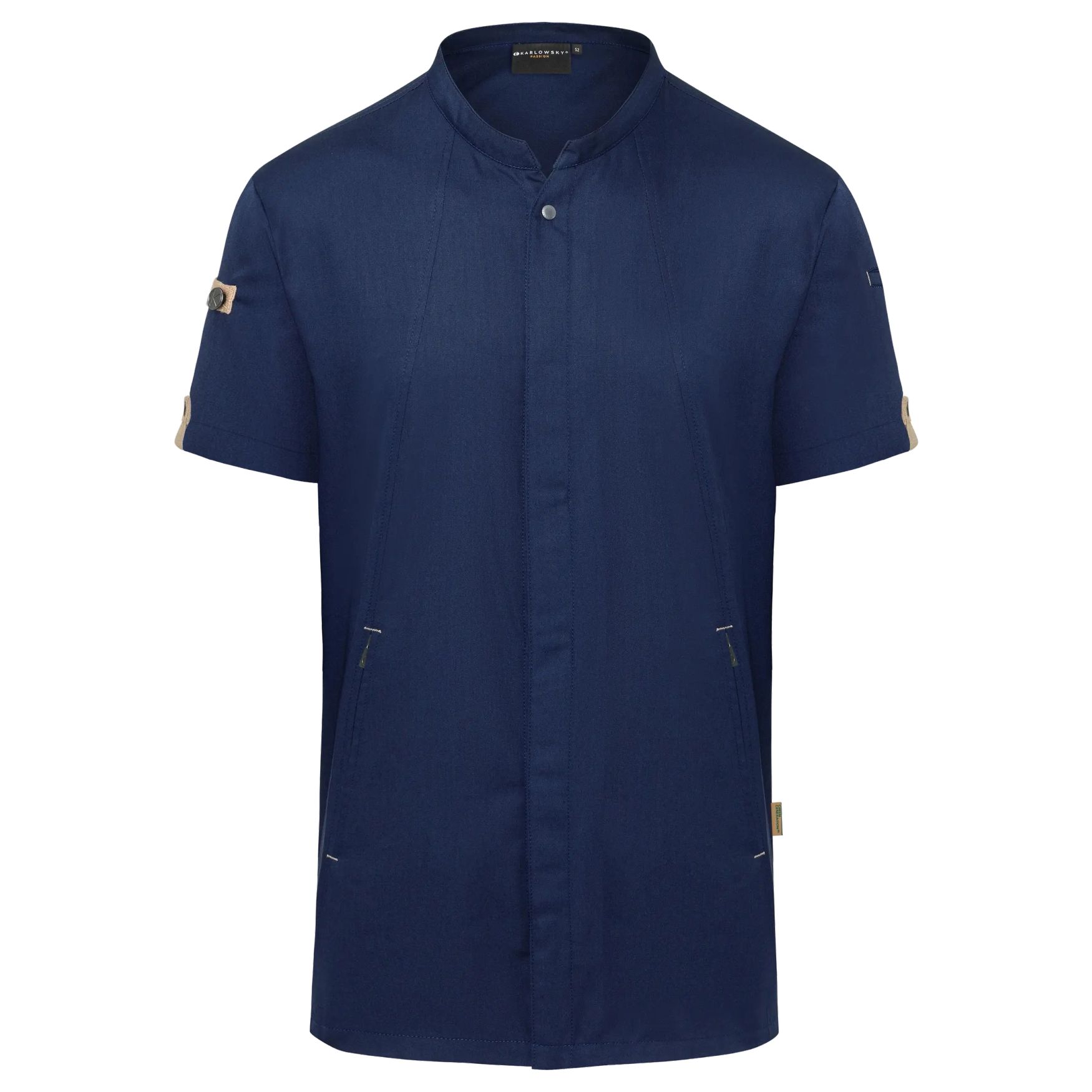 The Short sleeve chef jacket green-generation is a short-sleeve kitchen jacket with a slightly tapered fit and snap buttons. Front section with zippered pockets and a piped pocket on the left sleeve. Composition: 72% certified recycled polyester, 28% cotton. Customization available.