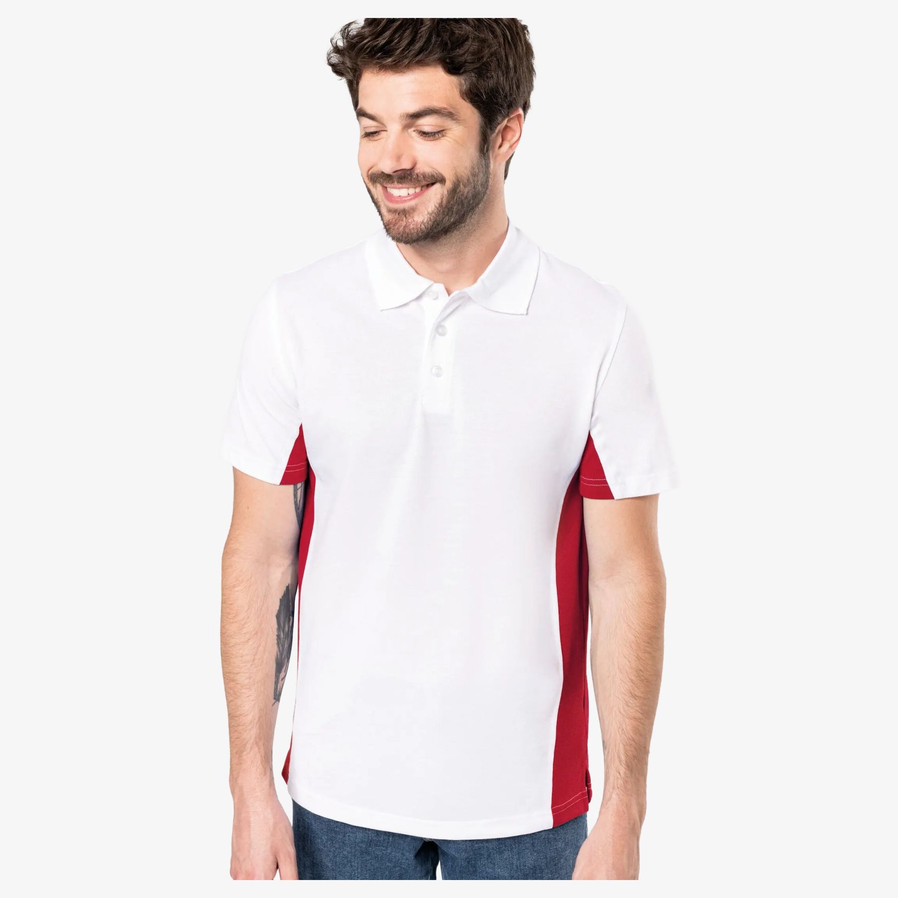 Bicolor pique polo made of polyester and cotton. It features a ribbed collar and a 3-button placket in the same color. Contrasting cuts are present on the sides and underside of the sleeves. Sleeve cuffs not gathered.
