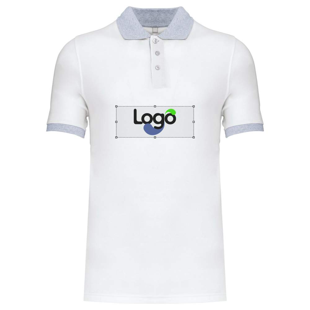 Bicolor pique polo man in 100% pre-shrunk cotton (Oxford Grey: 90% cotton / 10% viscose). Contrasting collar and sleeve hems. Contrasting neckband. Contrasting inner button placket with 3 buttons. Double-needle hem finish. Possibility of customization by embroidering or printing your logo.