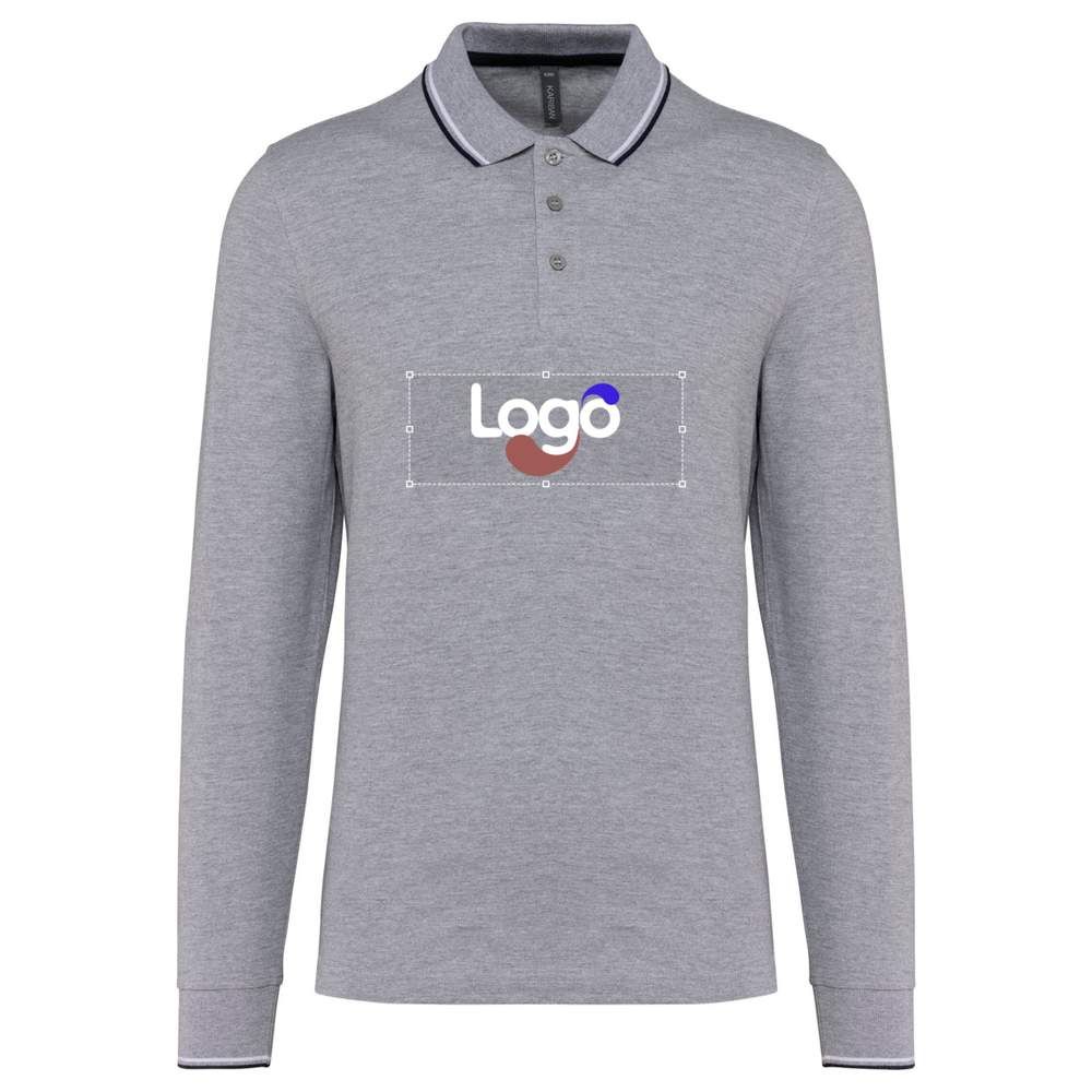 Long-sleeved piqué knit polo shirt for men. Fitted cut, made of combed cotton for optimal comfort. 3-button collar in matching tone for a neat appearance. Silicone shoulder reinforcement for better support and a structured silhouette. Contrasting neckband and side slits in the main material for a neat finish. 1x1 ribbed trim with contrasting edges on collar and sleeve hem for a modern style. Double-stitching on the bottom of the garment for increased durability. Brand label at the collar as well as a detachable size chip to facilitate customization. This polo is ideal for professionals wishing to display their visual identity. Possibility of customization with embroidery for a quality and durable result.