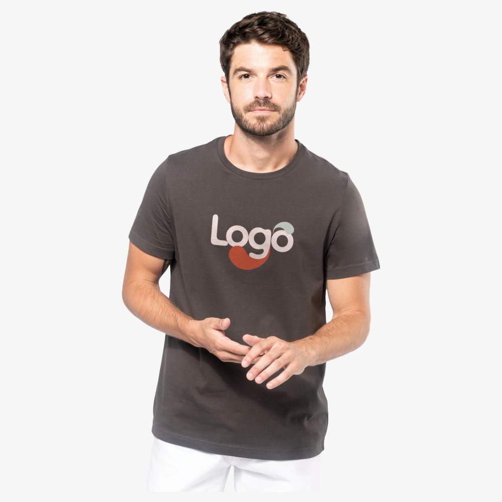 This round neck short sleeve men's t-shirt is made of 100% cotton with an enzyme wash for a soft and pleasant feel. Its fitted cut will highlight your silhouette. It features a contrasting gray heather neckband for all colors, and white on the white color. The careful finishes, with double stitching at the cuffs and hem, ensure great durability. This t-shirt is ideal for customization according to your wishes, whether it's to add your logo, an image or any other graphic element.
