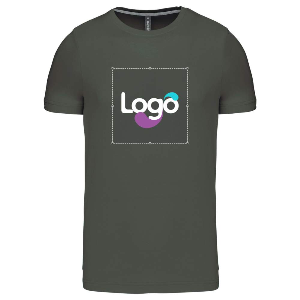 This round neck short sleeve men's t-shirt is made of 100% cotton with an enzyme wash for a soft and pleasant feel. Its fitted cut will highlight your silhouette. It features a contrasting gray heather neckband for all colors, and white on the white color. The careful finishes, with double stitching at the cuffs and hem, ensure great durability. This t-shirt is ideal for customization according to your wishes, whether it's to add your logo, an image or any other graphic element.
