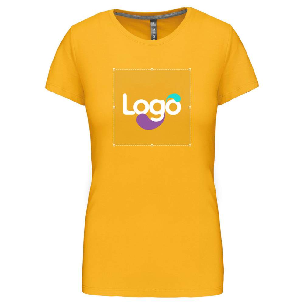 This women's 100% cotton t-shirt offers a fitted cut and optimal comfort. Its contrasting chin strap brings a touch of elegance. Double-needle stitching at the hem of the sleeves and garment ensures increased durability. Ideal for easy and effective customization, this t-shirt is perfect for displaying your logo or visual.