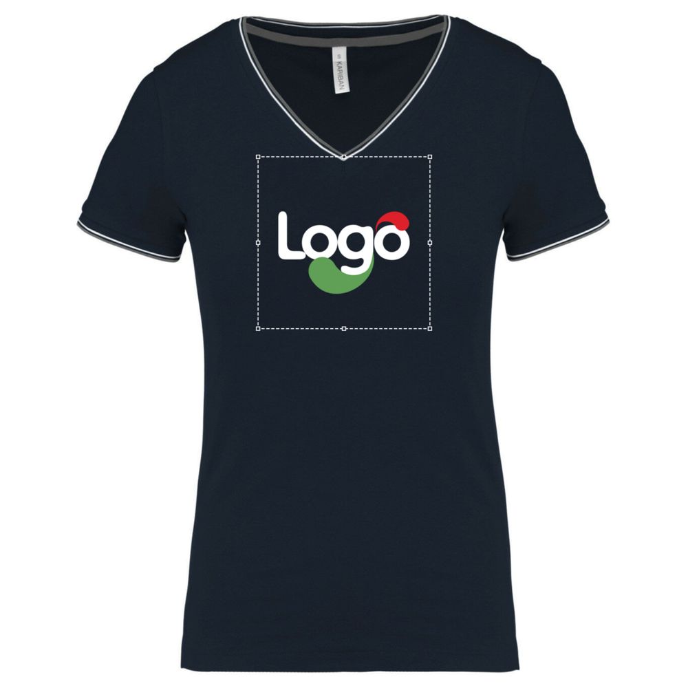 This women's V-neck piqué knit t-shirt offers optimal comfort thanks to its 100% cotton composition (90% cotton / 10% viscose for heathered colors). Its classic cut and V-neck make it a versatile piece for all occasions. The ribbed finishes with contrasting stripes on the collar and sleeve cuffs add a touch of elegance. The neckline tape and contrasting side slits enhance comfort and durability. The double-needle hem finish ensures a quality construction. This t-shirt is customizable, allowing you to add your logo or visual for effective communication.