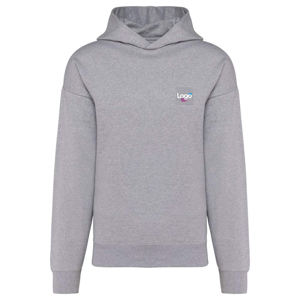 Unisex oversized hooded fleece sweatshirt. Oversized fit with dropped shoulders. Brushed fleece for optimal comfort. Carded cotton for unmatched softness. 2x1 ribbed finish for better finishing at the bottom of the sleeves and garment. Hidden pocket with invisible zip in the right side seam. Hood with pinned double layer in cotton. Presence of elastane in the ribbed bottom of the sleeves and garment to prevent the garment from deforming. Chevron-ton-on-ton propreté band. Half-moon interior collar. Double-stitch finish overlapping the bottom of the sleeves and garment. No brand label at the collar, only a size chip to facilitate customization. This sweatshirt is ideal for customization by embroidery or logo printing. Composition: 80% cotton, 20% polyester.