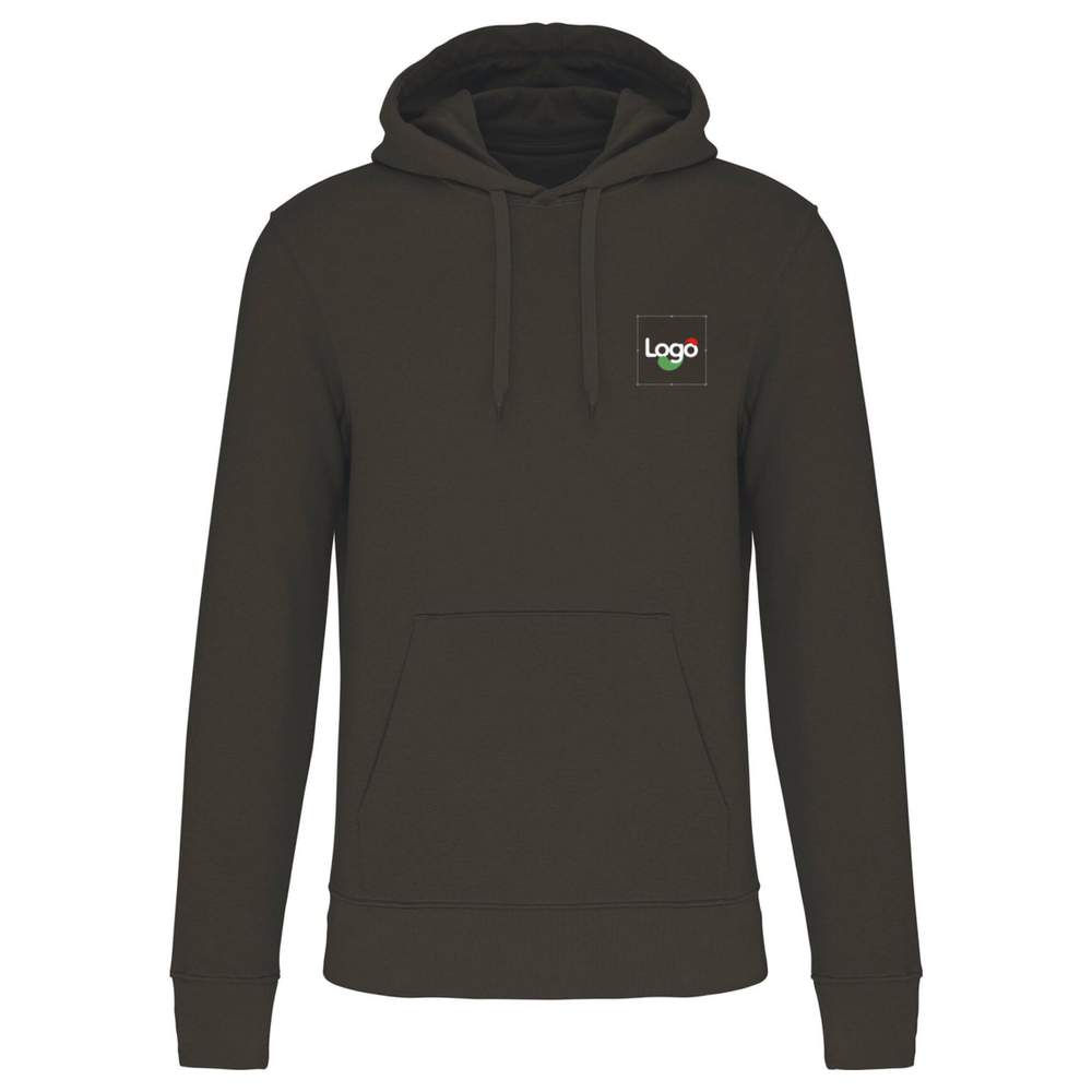 Hooded sweatshirt for men. Eco-friendly model. Brushed fleece 3 threads LSF (Low Shrinkage Fleece). Combed cotton. Enzyme wash. Straight cut. 1x1 ribbed hem with tubular binding for better finishing at the bottom of sleeves and garment. Kangaroo pocket. Hood lined 100% cotton. Jersey neckband same color as body, half-moon finish inside collar. Double-needle hem on sleeve ends, bottom of garment, and collar. No brand label on collar, only a size chip to facilitate customization. Composition: 85% organic cotton / 15% recycled polyester. Designed from 85% organic cotton and 15% recycled polyester. This sweatshirt offers an ideal surface for adding your logo or visuals with embroidery.