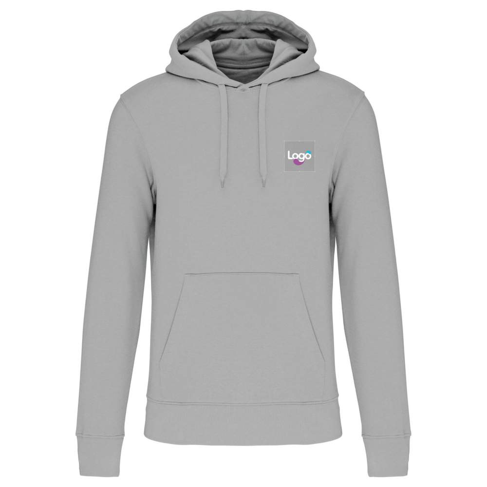 Hooded sweatshirt for men. Eco-friendly model. Brushed fleece 3 threads LSF (Low Shrinkage Fleece). Combed cotton. Enzyme wash. Straight cut. 1x1 ribbed hem with tubular binding for better finishing at the bottom of sleeves and garment. Kangaroo pocket. Hood lined 100% cotton. Jersey neckband same color as body, half-moon finish inside collar. Double-needle hem on sleeve ends, bottom of garment, and collar. No brand label on collar, only a size chip to facilitate customization. Composition: 85% organic cotton / 15% recycled polyester. Designed from 85% organic cotton and 15% recycled polyester. This sweatshirt offers an ideal surface for adding your logo or visuals with embroidery.