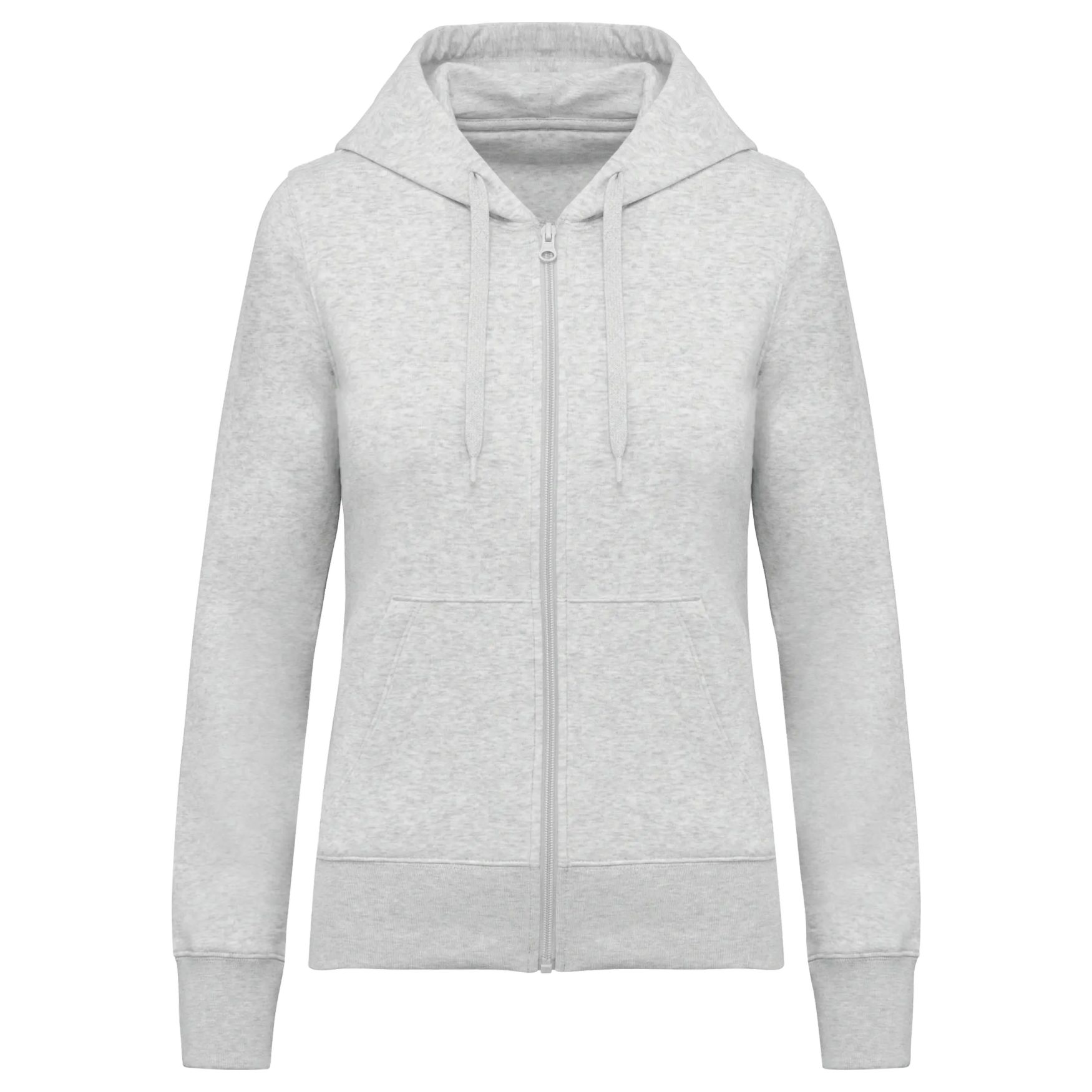 Women's hooded zip-up sweatshirt. Eco-friendly model made from 85% organic cotton and 15% recycled polyester. 3-thread LSF brushed fleece. Enzyme-washed combed cotton for a soft touch. Straight fit with practical kangaroo pockets. Matching nylon zipper for easy wearing. 100% cotton-lined hood, 180g jersey cotton for added comfort. 1x1 ribbed cuffs for better finishing on the sleeves and garment. Matching jersey neck tape and half-moon interior collar finish for optimal comfort. Double-needle hem on sleeves, garment bottom, and collar for increased durability. No brand label on the collar, just a size chip for easy customization.