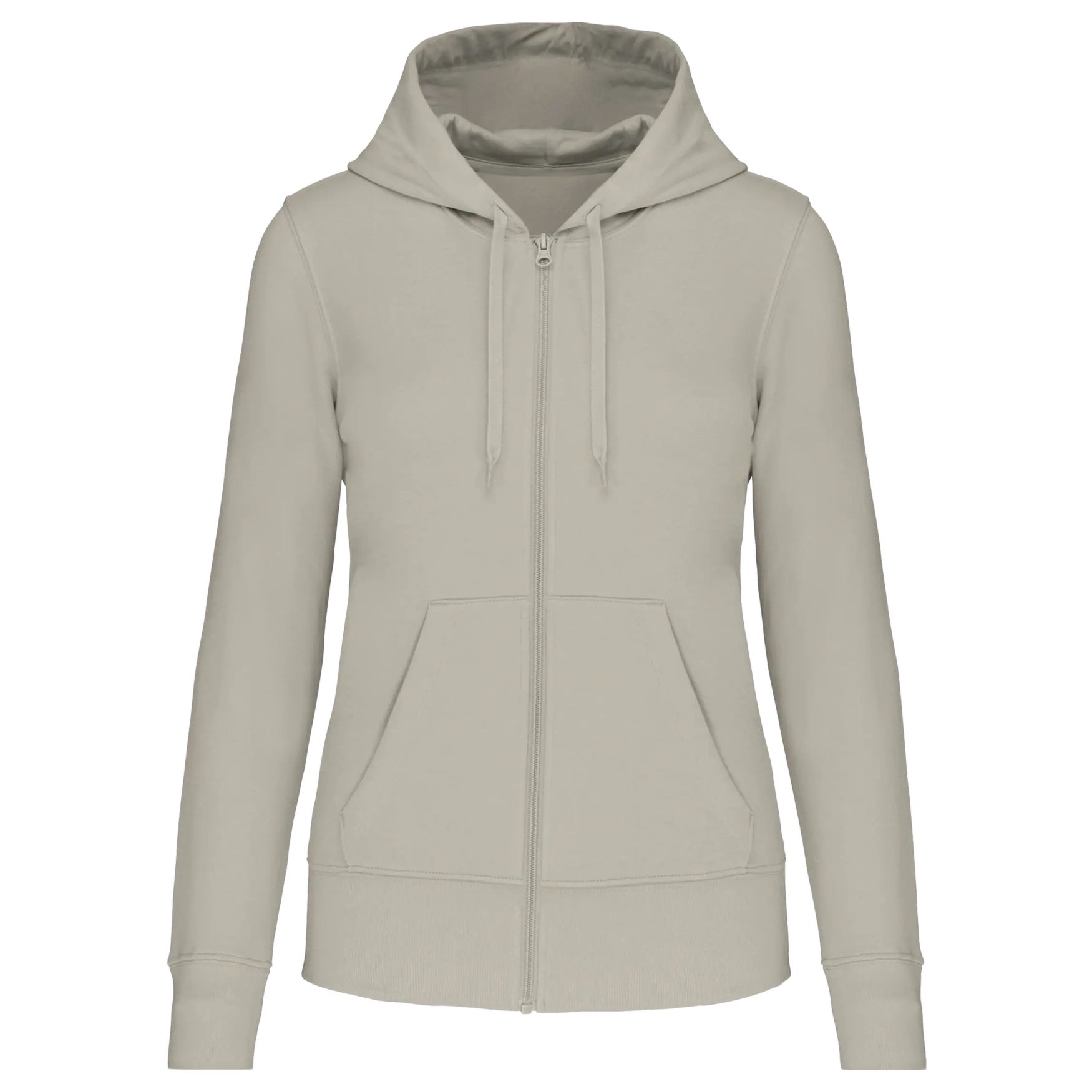 Women's hooded zip-up sweatshirt. Eco-friendly model made from 85% organic cotton and 15% recycled polyester. 3-thread LSF brushed fleece. Enzyme-washed combed cotton for a soft touch. Straight fit with practical kangaroo pockets. Matching nylon zipper for easy wearing. 100% cotton-lined hood, 180g jersey cotton for added comfort. 1x1 ribbed cuffs for better finishing on the sleeves and garment. Matching jersey neck tape and half-moon interior collar finish for optimal comfort. Double-needle hem on sleeves, garment bottom, and collar for increased durability. No brand label on the collar, just a size chip for easy customization.