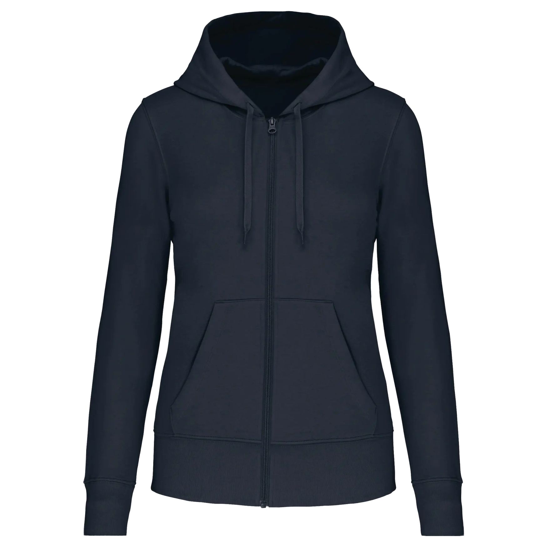 Women's hooded zip-up sweatshirt. Eco-friendly model made from 85% organic cotton and 15% recycled polyester. 3-thread LSF brushed fleece. Enzyme-washed combed cotton for a soft touch. Straight fit with practical kangaroo pockets. Matching nylon zipper for easy wearing. 100% cotton-lined hood, 180g jersey cotton for added comfort. 1x1 ribbed cuffs for better finishing on the sleeves and garment. Matching jersey neck tape and half-moon interior collar finish for optimal comfort. Double-needle hem on sleeves, garment bottom, and collar for increased durability. No brand label on the collar, just a size chip for easy customization.