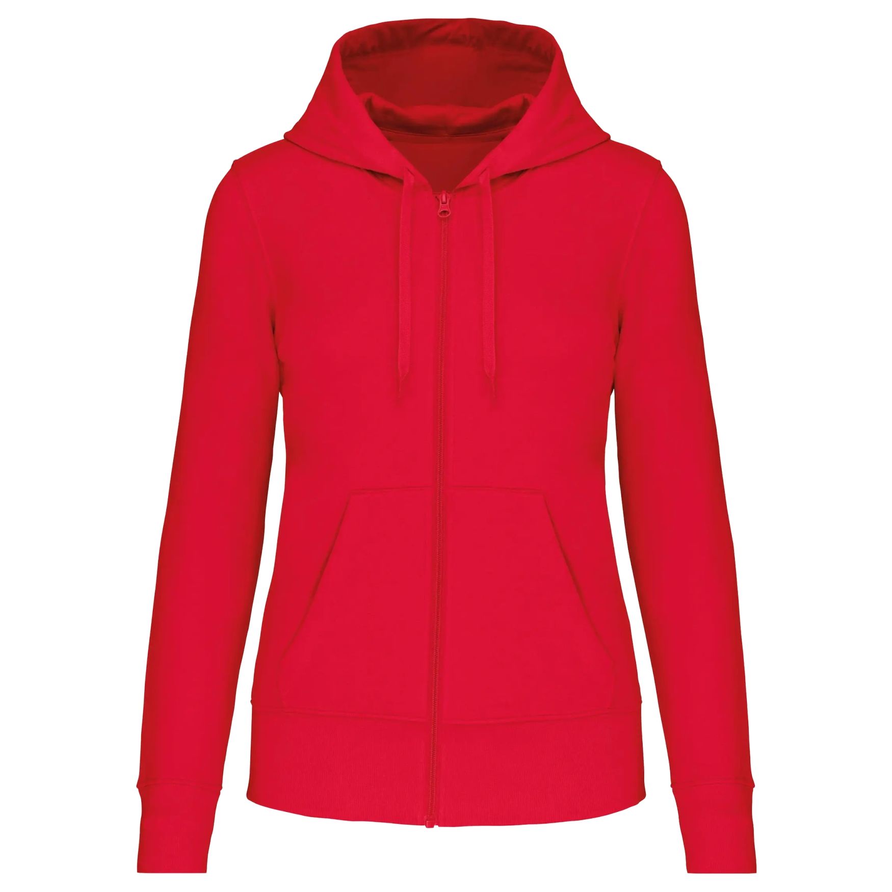 Women's hooded zip-up sweatshirt. Eco-friendly model made from 85% organic cotton and 15% recycled polyester. 3-thread LSF brushed fleece. Enzyme-washed combed cotton for a soft touch. Straight fit with practical kangaroo pockets. Matching nylon zipper for easy wearing. 100% cotton-lined hood, 180g jersey cotton for added comfort. 1x1 ribbed cuffs for better finishing on the sleeves and garment. Matching jersey neck tape and half-moon interior collar finish for optimal comfort. Double-needle hem on sleeves, garment bottom, and collar for increased durability. No brand label on the collar, just a size chip for easy customization.