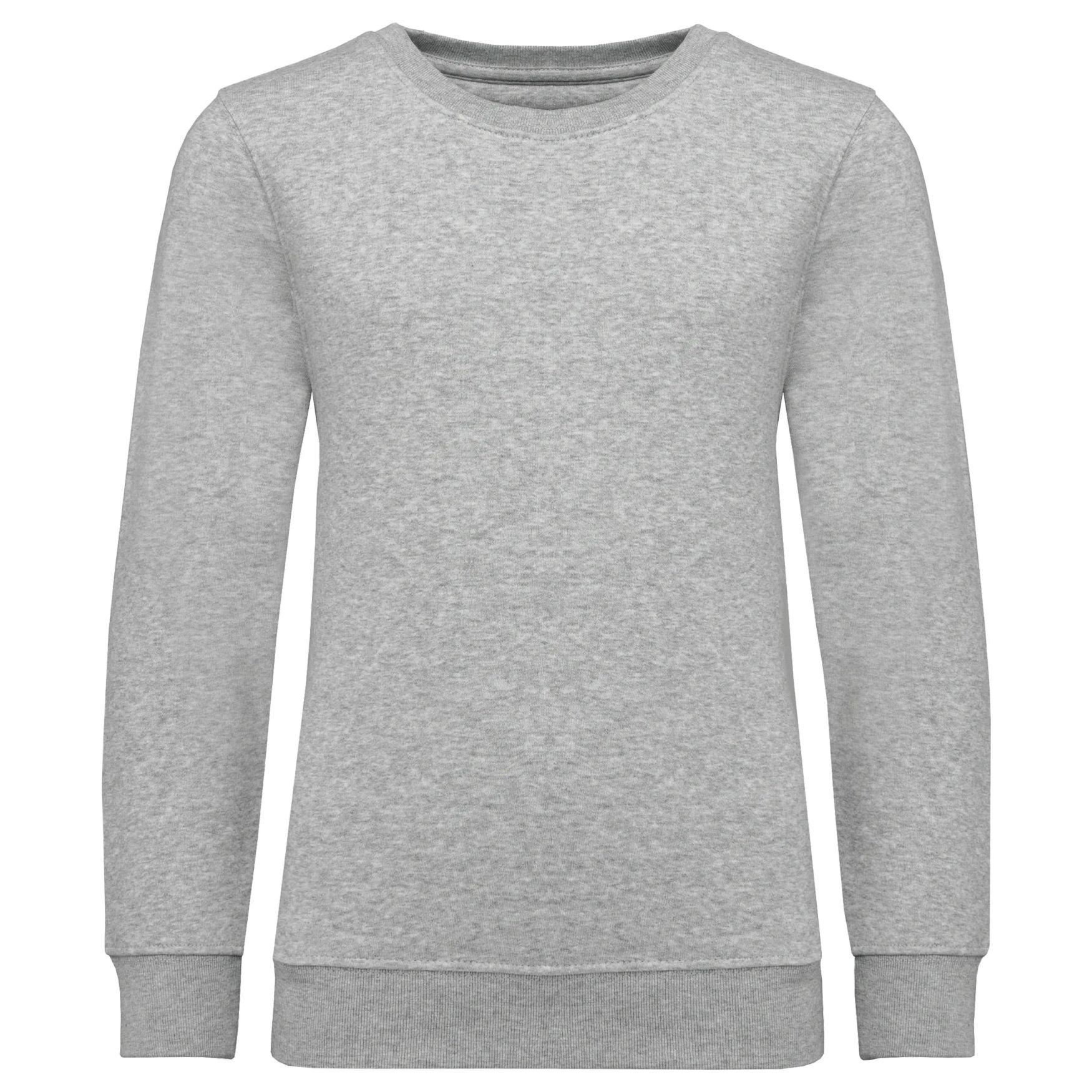 The child round neck sweatshirt is made of brushed fleece 3 threads LSF fabric with anti-pilling treatment. It features a slim fit, ribbed 1x1 neckline and cuffs, with double topstitching on shoulders, armholes and sleeve ends. The garment has a tone-on-tone jersey neck tape inside the collar, a half-moon at the back, a name label and a size tag for easy customization. Composition 80% cotton, 20% polyester.