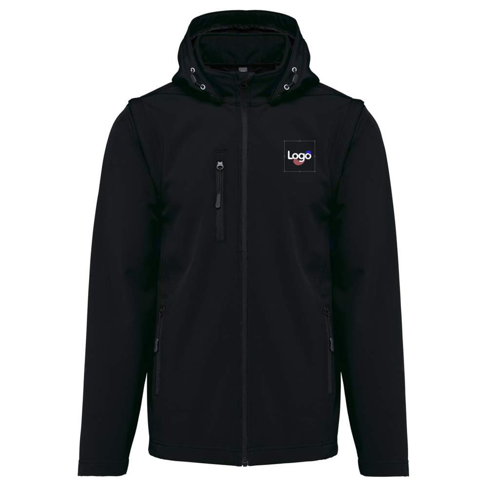Unisex softshell jacket with hood and removable sleeves. Fitted cut. Zip closure. 2 zip pockets on the front and one zip pocket on the right side when worn. Removable hood with press buttons and drawstring. Removable sleeves with zip. Double-needle hem finish on sleeve and garment. Possibility of customization with embroidery. Laminated 3-layer breathable fabric. 3000 /24 h and waterproof 8000 mm. Exterior: 95% polyester, 5% elastane. Intermediate: breathable membrane. Inner layer: microfleece. Composition: 95% Polyester, 5% Elasthanne.
