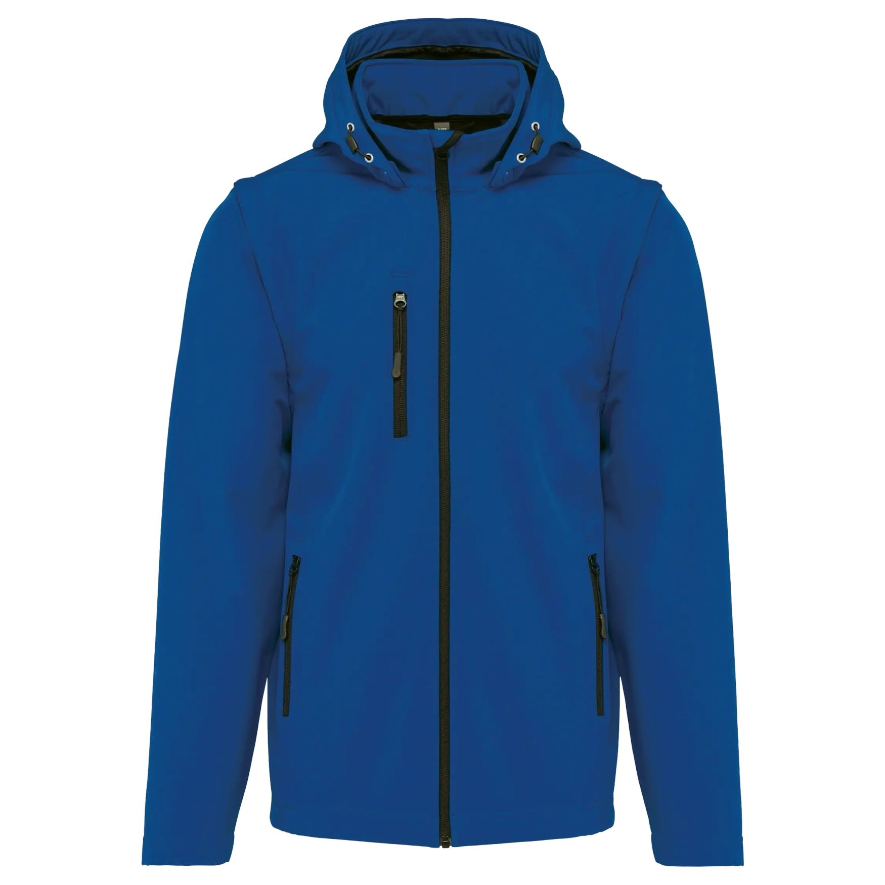 Unisex softshell jacket with hood and removable sleeves. It features a fitted cut and a zip closure. It is equipped with two front zip pockets and a zip pocket on the right side. The hood is removable with snap buttons and an adjustable drawstring is also included. The sleeves are removable with a zip. A double-needle hem is present at the end of the sleeves and the garment. 3-layer breathable bonded fabric offering and waterproofness of .