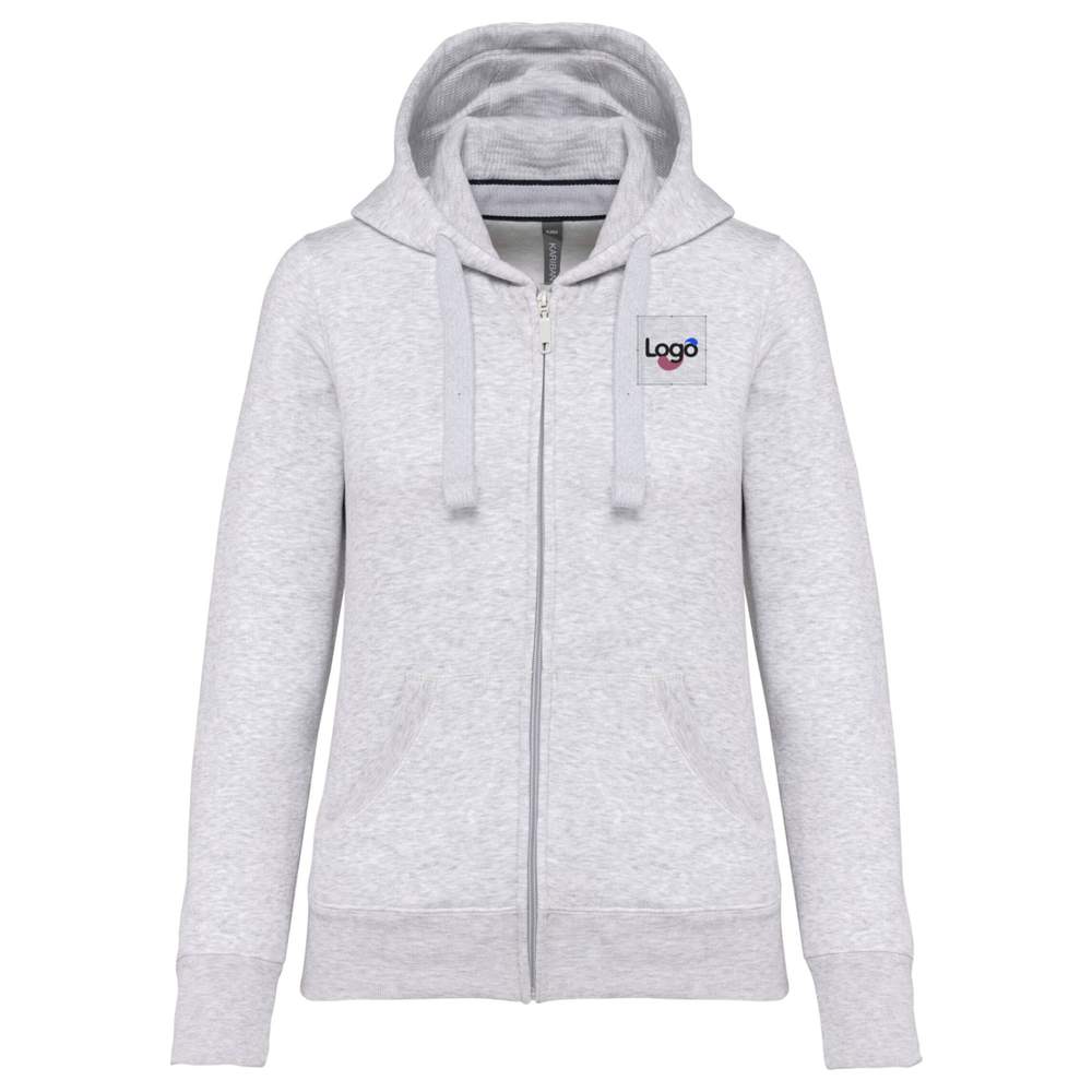 Women's zip-up hoodie, made of cotton fleece. Soft fleeced lining for optimal comfort. Contrasting collar band (navy for the oxford grey color and oxford grey for all other colors). Honeycomb-lined hood. Practical kangaroo pockets for everyday use. Ribbed cuffs and hem for better fit. Durable and reliable YKK® zipper closure. This hoodie is perfect for customization with embroidery or the addition of your logo or visual.