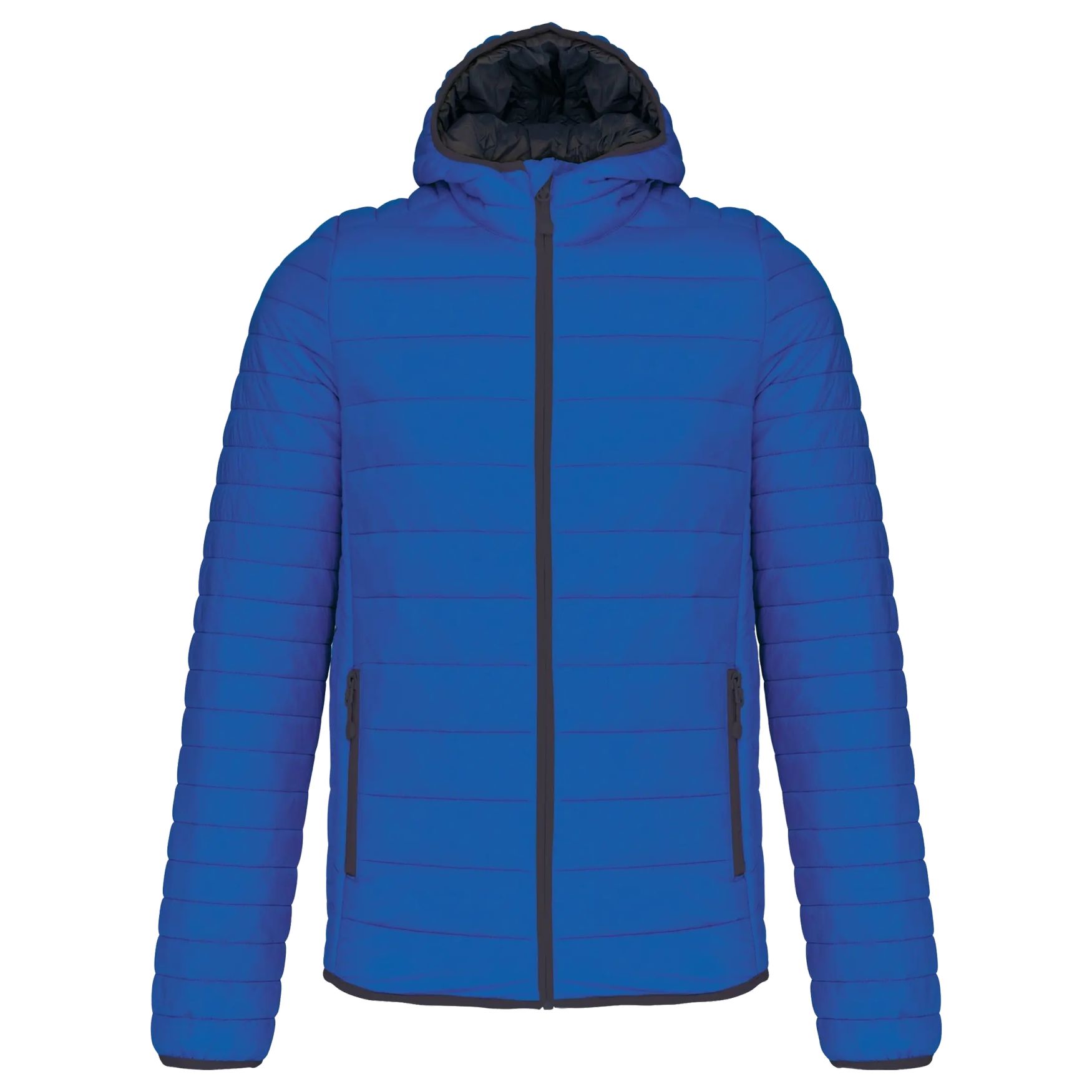 This lightweight hooded jacket for men offers optimal comfort thanks to its design in 100% polyamide and its polyester inner lining. Warm and ultra-lightweight, it is compressible into its storage bag for easy transport. It features two zipped pockets on the front. The inside and the hood are contrasting (except for navy blue).