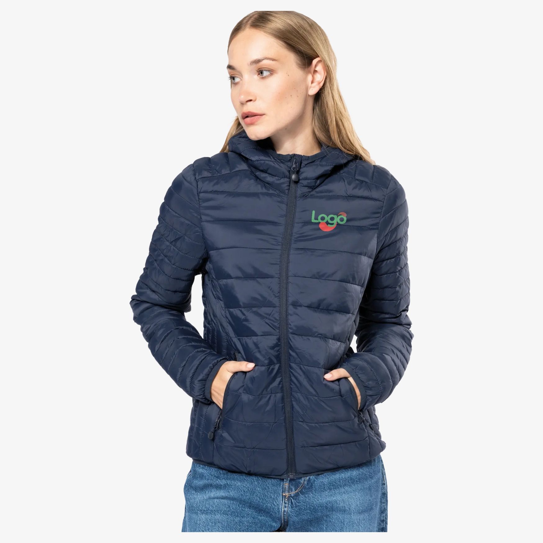 This lightweight hooded jacket for women offers optimal thermal comfort thanks to its polyester inner filling and outer fabric made of 100% polyamide. Ultralight and compressible in its storage bag, it is ideal for outdoor activities or everyday use. It features two practical zippered pockets for storing your personal belongings. The contrasting interior and hood add a touch of style. This jacket is designed to offer an excellent warmth-to-weight ratio. It can be customized with your logo or visual, making it an excellent support for promoting your brand or for giving a original and useful corporate gift.
