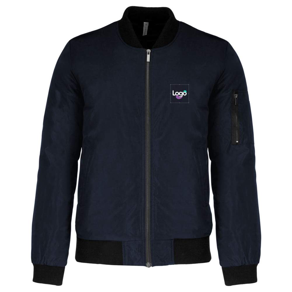 Men's 100% polyester bomber jacket with quilted polyester lining. Zip closure, 2 welted pockets in front, zipped patch pocket with pen pocket on the left sleeve and welted inner pocket. Rib-knit collar, cuffs and hem. 1 zip at the heart side and 1 zip at the bottom of the garment to facilitate access for customization. This jacket offers an ideal surface for adding your logo or any other visual. Possibility of embroidery customization for an elegant and durable result.