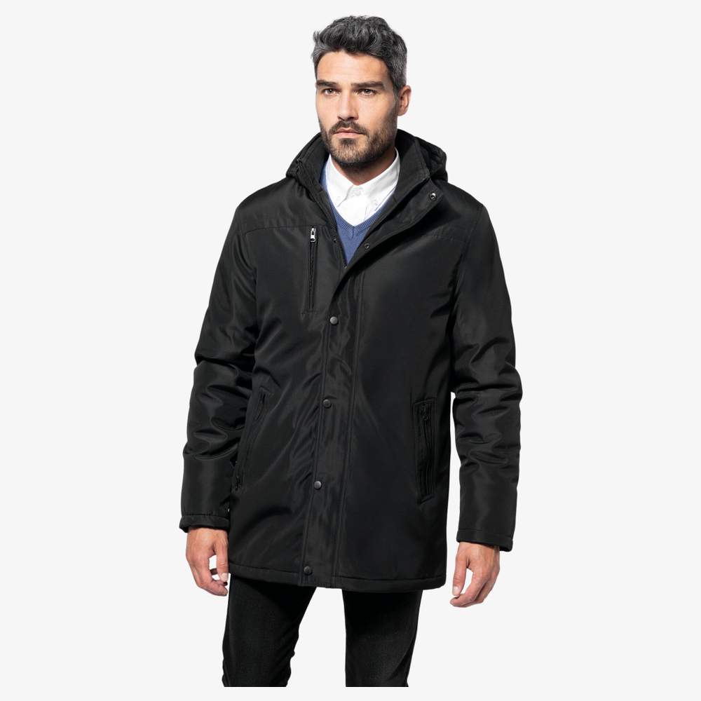 This polyester parka jacket offers a bi-material design with a micropolar fleece lining on the upper body and a quilted lining on the lower part. It features a satin outer fabric and includes two side pockets, one chest pocket and two zippered inner pockets. The inner collar is in ribbed fabric and the hood is removable, lined with fleece. The zipper closure is equipped with a double slider and a flap. The cuffs are equipped with inner ribbed fabric and a bicolor fancy inner band completes the design. A side zip and a zip at the bottom of the garment allow easy access for customization.